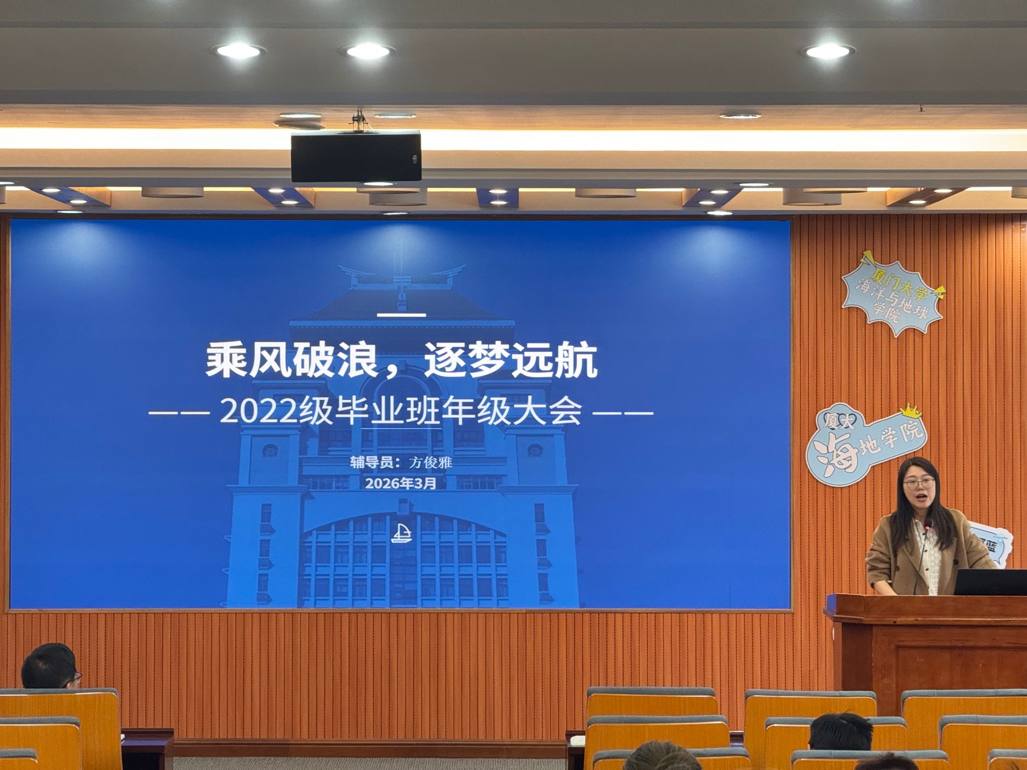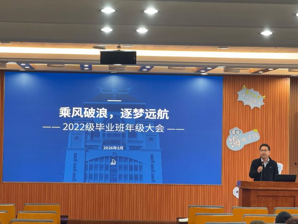 为明确毕业季各项安排,助力毕业生顺利完成学业、有序开启人生新篇章,2026年3月19日,我院在希平楼C2-403召开2026届本科毕业生年级大会。学院党委副书记钟书库、团委副书记方俊雅及教学秘书陈雅琪出席会议,2026届本科毕业生以线上线下相结合的方式参会。