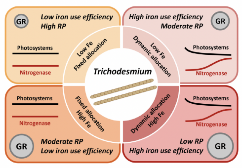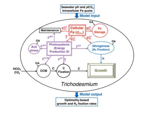 2019年,该团队与厦门大学史大林教授团队合作,在Nature Communications上发表了基于稳态的束毛藻藻丝体最优能量与铁分配细胞模型。研究量化了海洋酸化如何影响束毛藻的胞内过程,指出酸化主要通过降低固氮酶效率来抑制其固氮速率。基于该模型,该研究预测若人为CO2排放持续增加,本世纪末海洋酸化可能导致全球束毛藻的固氮潜力下降27%。该工作为定量理解海洋酸化对束毛藻固氮作用的影响奠定了基础。