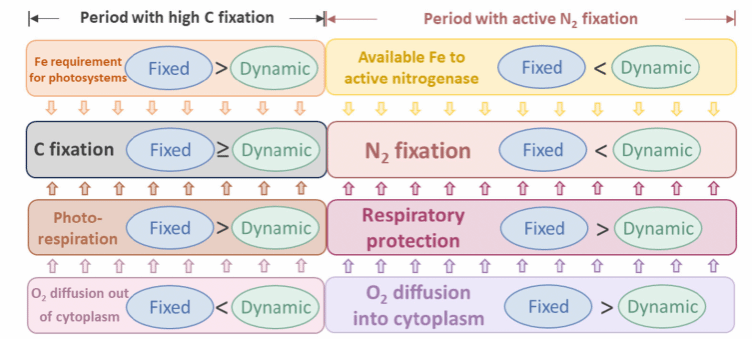 为了探讨光合产氧与固氮忌氧在束毛藻胞内的并存机制,2022年团队在mSystems上发表了引入日间变化的生理模型。模型分析表明,束毛藻可能无需严格的光合与固氮的空间隔离(即分化出专门的固氮细胞),仅依靠时间上的隔离及呼吸保护等机制,即可在日间维持较低的胞内氧气水平并实现固氮。这一结果为解释此前文献中关于“是否存在空间隔离”的不同观测证据和认识分歧提供了理论参考。