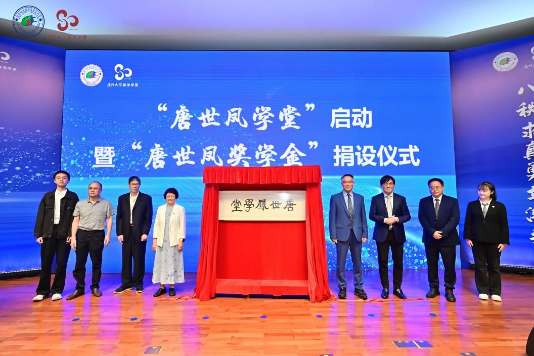 在致敬海洋学系创始人唐世凤先生环节,与会嘉宾共同观看了唐世凤先生雕像揭幕仪式短片。唐乐永,洪华生,焦念志,戴民汉,“唐世凤”海洋学科讲席教授、“唐世凤奖学金”捐资人李忠平、柴扉,以及学生代表段姗秀、丁衡正共同为“唐世凤学堂”揭牌。学堂将承载唐世凤先生“谋中国海洋科学事业之发展”的办学宗旨,致力于培养胸怀蓝色梦想、堪当时代重任的的海洋拔尖人才。唐乐永先生受邀讲话。