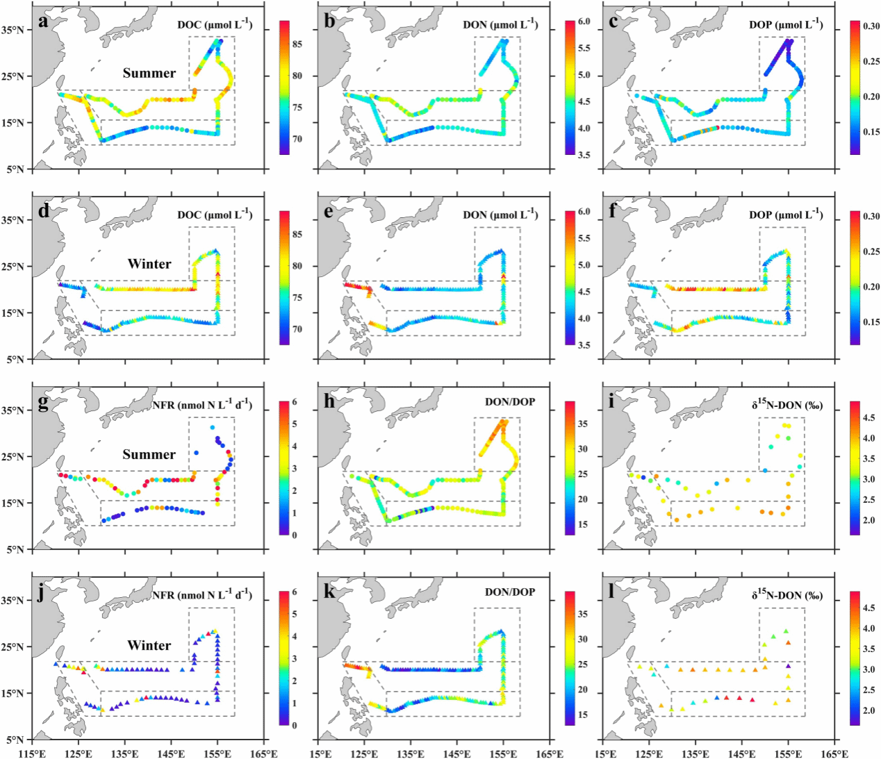 图2. 西北太平洋副热带流涡区溶解有机物参数的空间分布。夏季(上)和冬季(下)的溶解有机碳(a,d)、溶解有机氮(b,e)、溶解有机磷(c,f)、固氮速率(g,j)、DOM氮磷比(h,k)以及δ15N-DON(i,I)