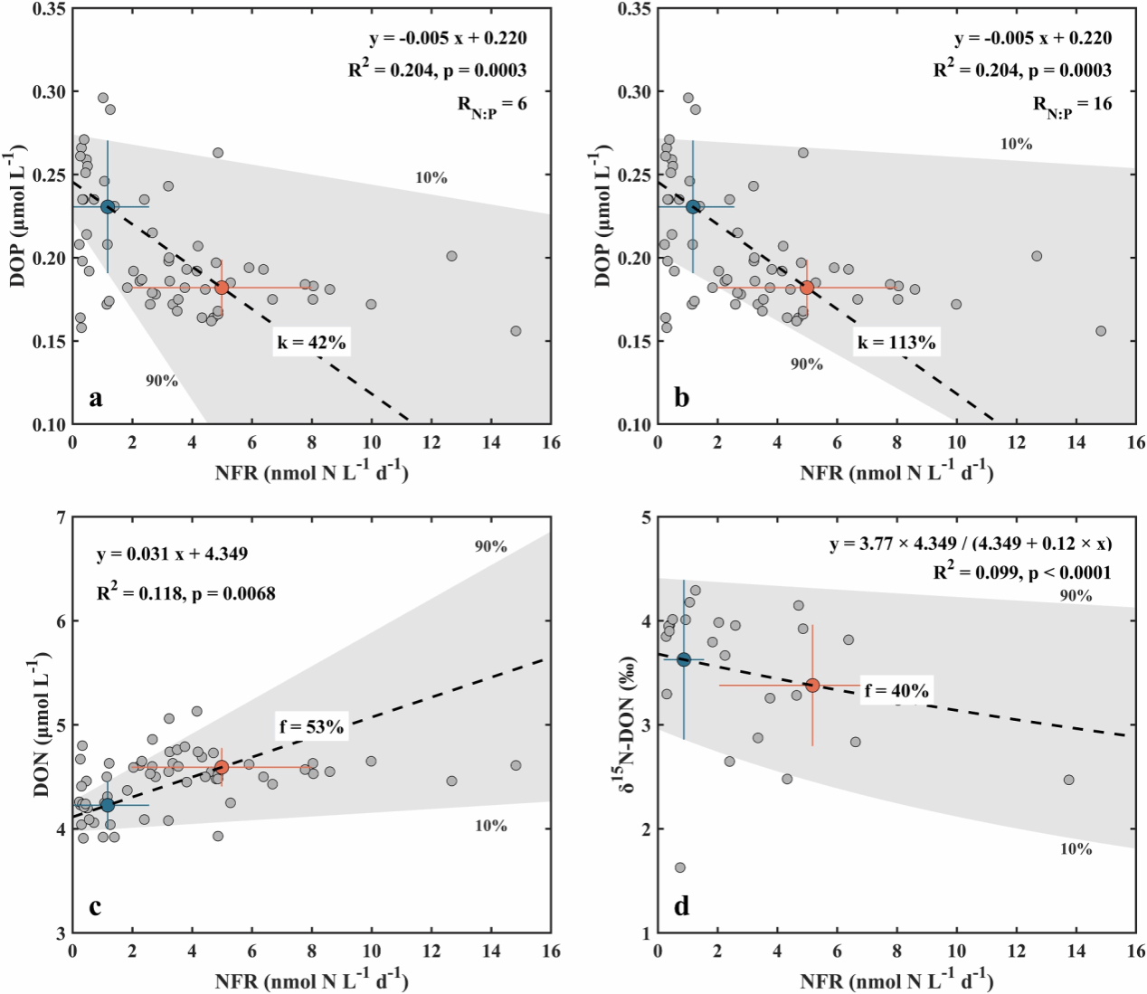 图3. 固氮速率与溶解有机物参数的定量关系。(a-b)DOP消耗对固氮磷需求的贡献;(c-d)基于质量平衡(c)和氮同位素模型(d)估算的固氮向DON库的释放比例。红色点代表夏季均值,蓝色点代表冬季均值