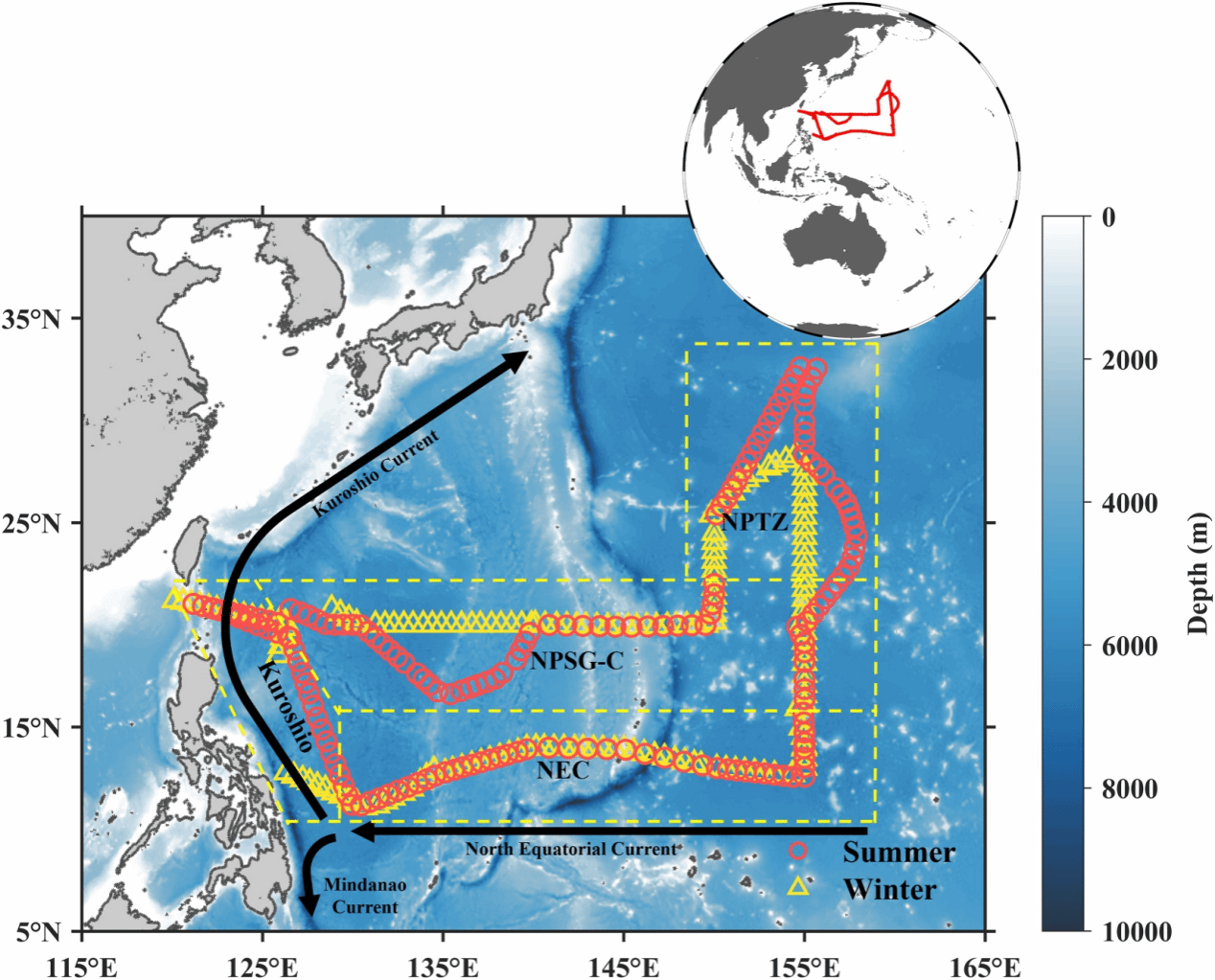 图1. 西北太平洋副热带流涡区夏季(红色圆点)和冬季(黄色三角形)采样点分布。虚线划分了黑潮、北赤道流、北太平洋过渡带和流涡中心区四个子区域