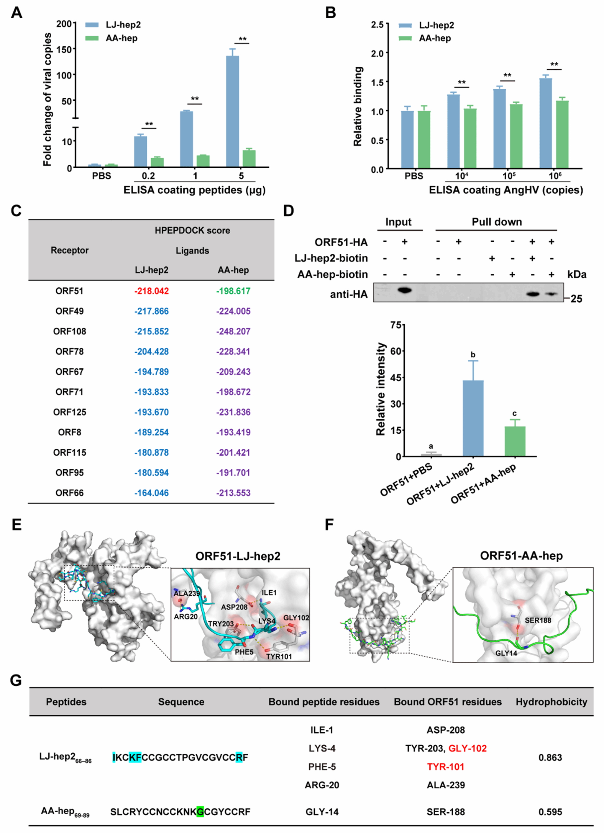 前期结果显示LJ-hep2能直接抑制AngHV进入宿主细胞,并破坏病毒粒子完整性,推测LJ-hep2可能直接作用于病毒粒子。机制研究揭示,LJ-hep2具有结合病毒包膜蛋白ORF51的能力,ORF51是潜在的抗AngHV药物靶点;LJ-hep2的N端第4位赖氨酸(Lys-4)和第5位苯丙氨酸(Phe-5)是决定抗病毒活性的关键残基,其较高疏水性有助于插入病毒膜并发挥灭活作用;LJ-hep2可与ORF51的多个关键氨基酸位点(如ASP-208、TYR-203等)形成稳定相互作用;这些结合位点位于ORF51跨膜区域,LJ-hep2与之结合可导致病毒膜结构发生构象改变,从而破坏病毒完整性。
