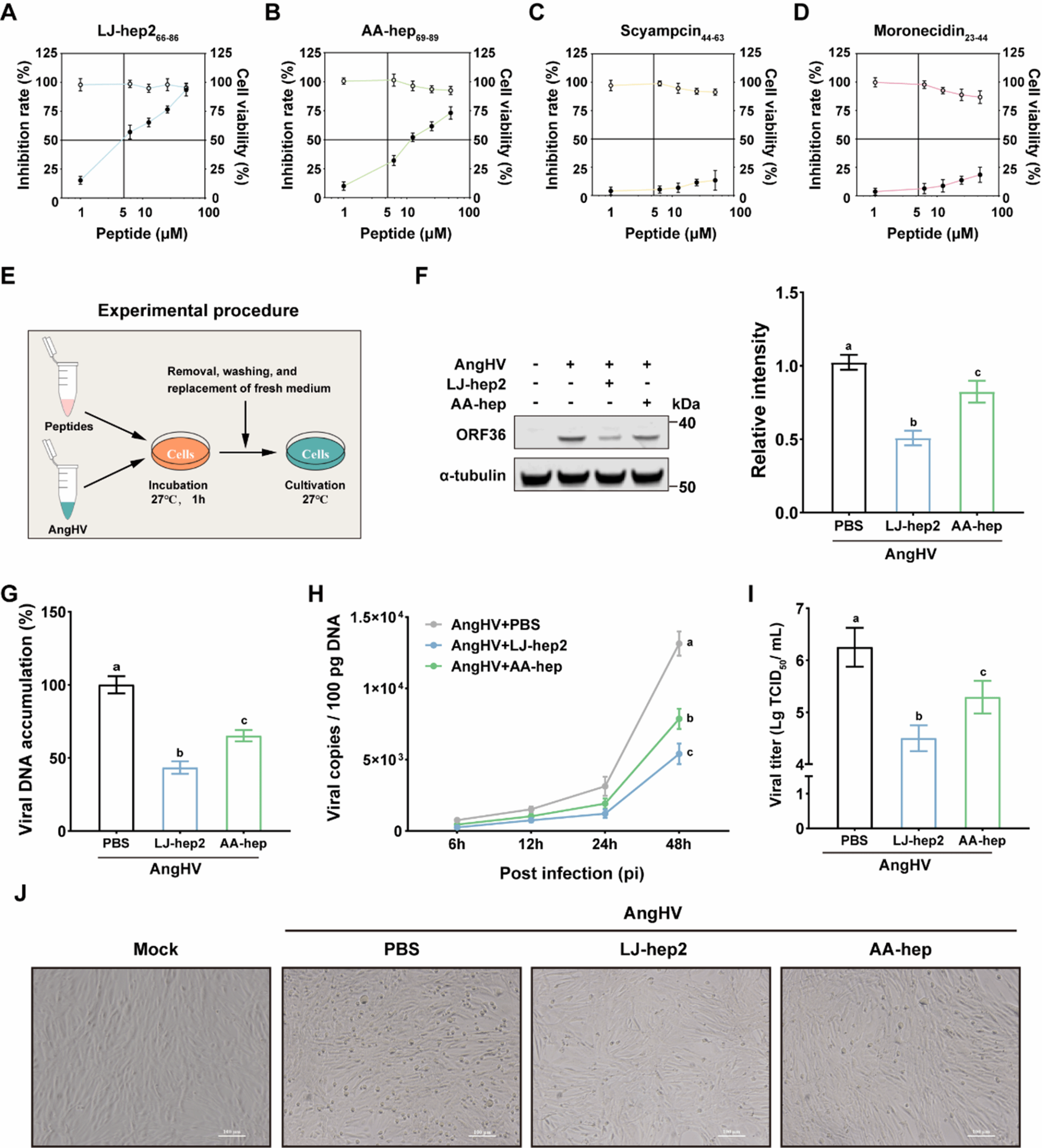 该研究首先对课题组前期已获得的多种海洋动物抗菌肽进行抗病毒活性评价,发现源于花鲈Hepcidin的短肽LJ-hep2可显著抑制AngHV感染,且抗病毒活性优于鳗鲡源Hepcidin。