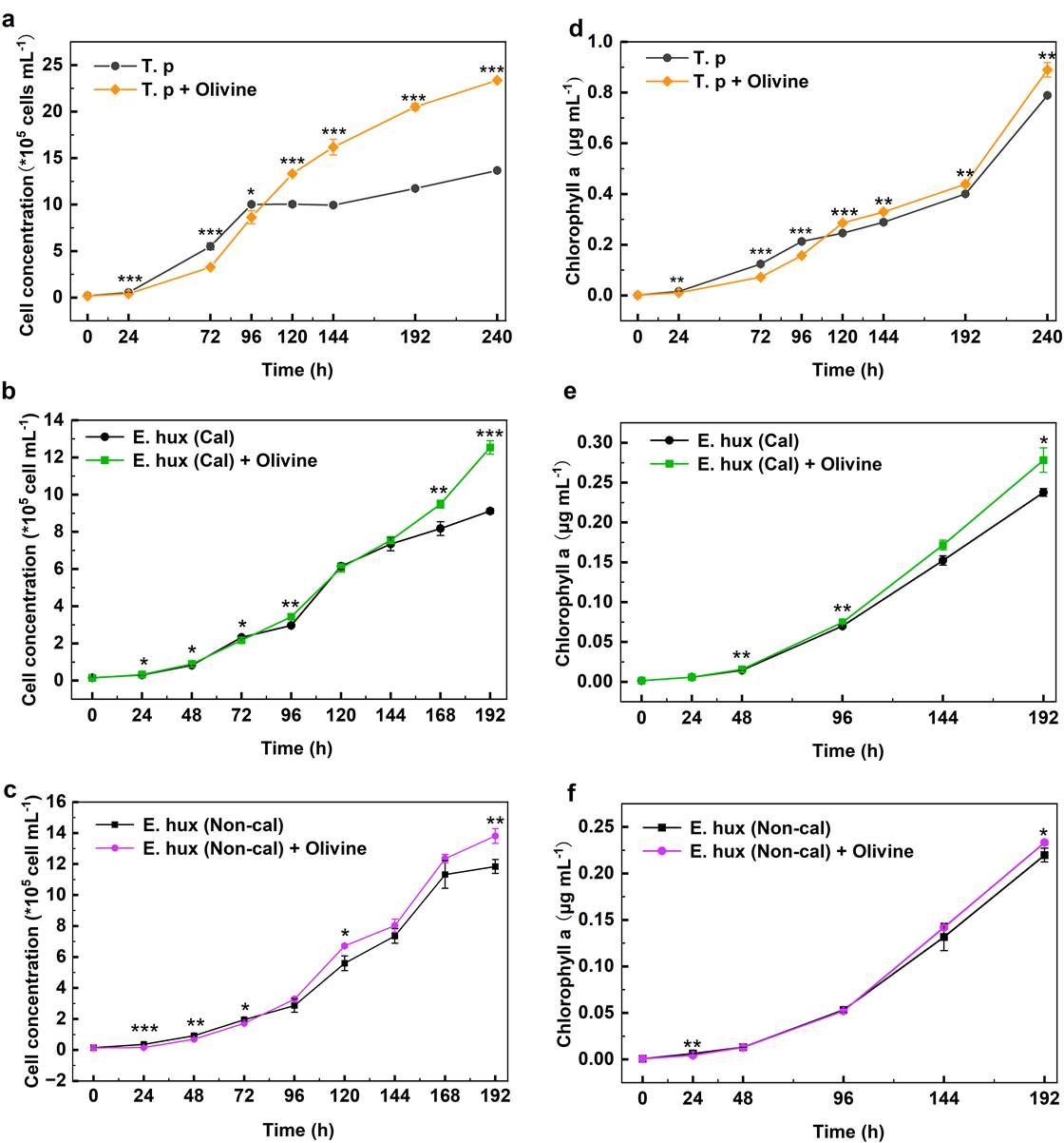 图3在培养过程中,有无橄榄石存在条件下,假微型海链藻(T. pseudonana, T. p)(a)、钙化赫氏颗石藻(E. huxleyi, E. hux(cal))(b)及非钙化赫氏颗石藻(E. hux(non-cal))(c)的细胞浓度变化;以及假微型海链藻(T. p)(d)、钙化赫氏颗石藻(E. hux(cal))(e)与非钙化赫氏颗石藻(E. hux(non-cal))(f)的叶绿素a浓度变化。数据以均值±标准差表示(n = 3)。不同处理间的显著性差异以符号标注 (*p < 0.05; **p < 0.01; *** p < 0.001)