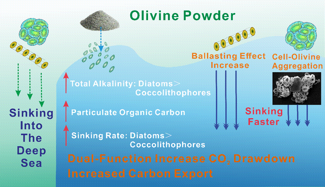 这项研究揭示了橄榄石诱导的海水碱度增加(OAE)不仅能直接吸收二氧化碳,还能通过促进浮游植物生长增加有机碳产量,并进一步借助橄榄石溶解产生的硅所介导的“压舱效应”和胞外多糖引起的“絮凝作用”,显著加速硅藻和钙化颗石藻的沉降速率,从而具有增强碳输出的潜力。因此,橄榄石溶解一方面通过海水碱化促进吸收CO₂,另一方面又可协助增强生物泵的有机碳输出能力,从而展现出实现海洋碳汇双重增益的潜力。