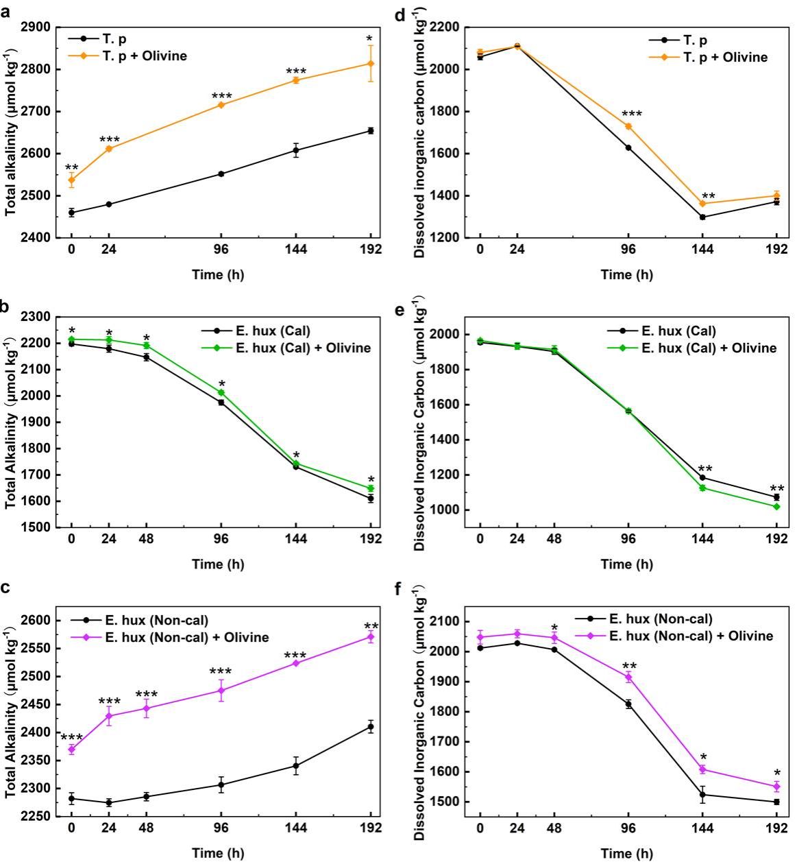 图2 在添加与未添加橄榄石的条件下,三种浮游植物株系在培养过程中碳酸盐的变化情况:假微型海链藻 (T. p) (a)、钙化赫氏颗石藻 E. hux (cal) (b) 以及非钙化赫氏颗石藻 E. hux (Non-cal) (c) 的**总碱度(TA)变化;以及上述对应的假微型海链藻 (d)、钙化赫氏颗石藻 (e) 和非钙化赫氏颗石藻 (f) 的溶解无机碳(DIC)**浓度变化。数据以平均值 ± 标准差(mean ± SD, n = 3)表示。不同处理组间的显著性差异以符号标注(*p < 0.05; **p < 0.01; ***p < 0.001)。注: 标称“0 小时”处测得的 TA 值在不同处理组间已存在差异,这是由于橄榄石在样品采集窗口期内发生了初始的快速爆发性溶解。