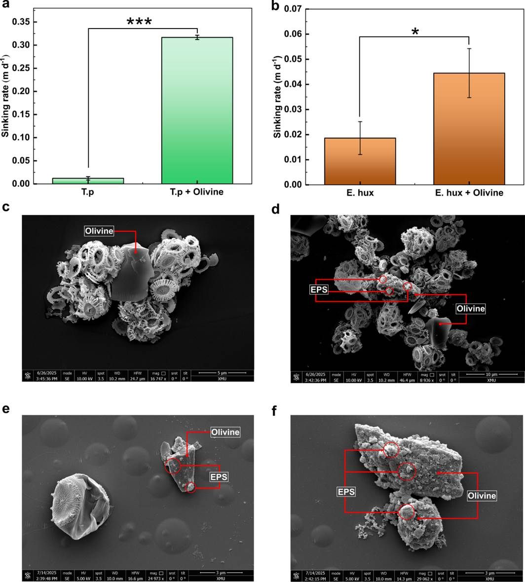 图4 添加与未添加橄榄石条件下(基于叶绿素a浓度),假微型海链藻(T. p)(a)与钙化赫氏颗石藻(E. hux)(b)的沉降速率。数据以平均值 ± 标准差(mean ± SD, n = 3)表示。不同处理组间的显著性差异以符号标注(*p < 0.05; **p < 0.01; ***p < 0.001)。扫描电子显微镜(SEM)图像显示:在钙化赫氏颗石藻细胞上附着有橄榄石颗粒 (c, d);在添加橄榄石的钙化赫氏颗石藻培养体系中,橄榄石颗粒表面存在类胞外聚合物(EPS)物质 (d)。而在添加橄榄石的假微型海链藻培养体系中,橄榄石颗粒表面也附着有类 EPS 物质,但橄榄石颗粒与假微型海链藻无聚集现象 (e, f)。Olivine:橄榄石,EPS:胞外多糖