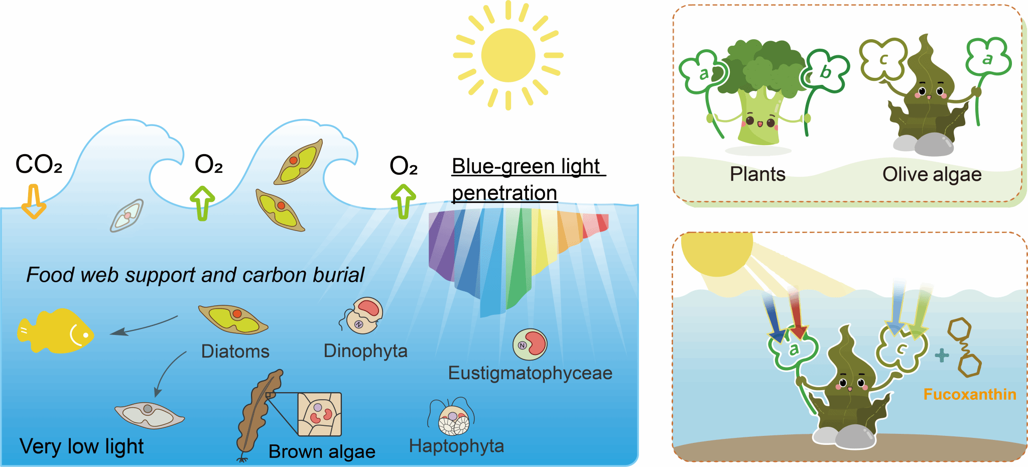 地球上大约一半的光合作用发生在海洋中,仅硅藻每年就为地球贡献了20%的初级生产力。与陆生植物相比,海洋藻类在长期演化过程中适应了水下蓝绿光为主的光照环境,演化出一套独特的光合捕光策略,占主导地位的真核藻类利用叶绿素c和岩藻黄素(Fucoxanthin)替代了陆地植物的叶绿素b与叶黄素,用于扩宽其蓝绿光捕获能力。团队围绕“海洋藻类光合色素的生物发生”为题开展了一系列研究工作,优化并整合了多种海洋微藻遗传学和组学技术工具,解析了海洋捕光色素独特的生物合成途径。这些新发现的基因为进一步利用海洋遗传资源以及光系统改造与设计奠定了基础。