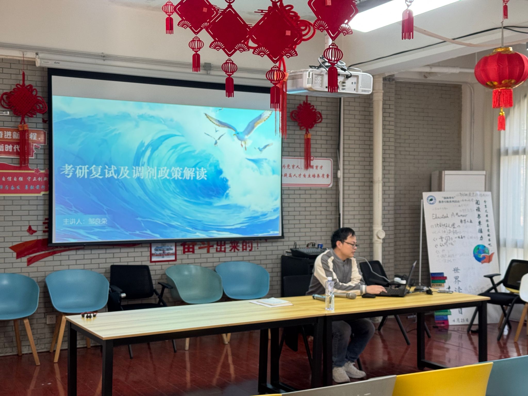 邹老师围绕复试的全过程展开讲解,着重指出全面、准确的资讯是有效备考的前提。他提醒同学们务必清晰了解复试的具体日程、差额淘汰比例及各环节分值权重,并应提前系统梳理并备好个人简历、学业成绩单及科研实践总结等支撑材料,从而在面试环节中完整呈现自身的学术积累与研究潜质。最后,他勉励在场同学保持信心,以沉稳的心态充分发挥个人长处,积极迎接考核。