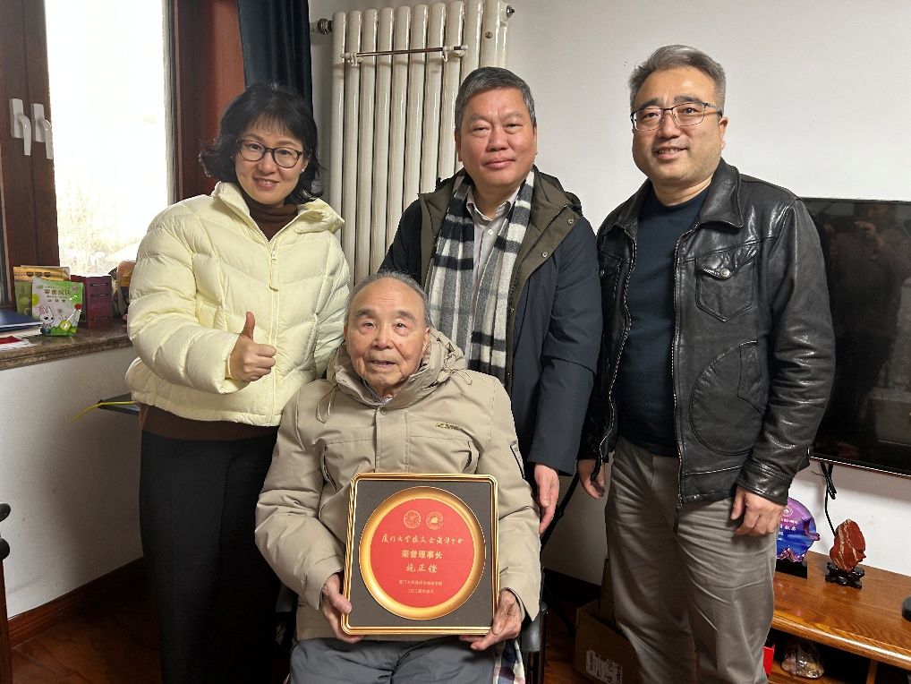 走访团首先拜望了1950级杰出校友、原中国海洋大学校长施正铿先生。吴立武向施正铿老校友介绍了厦门大学海洋学科建设的最新进展、海洋与地球学院在科研创新、人才培养、社会服务等领域取得的标志性成果、学院为迎接厦门大学海洋学系建系80周年策划的系列活动以及厦门大学校友会海洋分会筹建青岛站(简称海洋分会青岛站)的情况。施正铿老校友虽已至鲐背之年,依然精神矍铄,开朗健谈。他对母院一行的到访表示诚挚欢迎,深情追忆了在厦大的求学经历,分享了毕业后投身祖国建设和推动海洋事业发展的历程和感悟,对学院近年来取得的成绩给予高度肯定,并表示将支持海洋分会青岛站的筹建工作,期许该平台为校地海洋事业协同发展贡献力量。