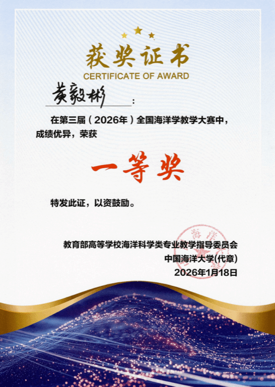 1月17日至18日,第三届(2026年)全国海洋学教学大赛在天津举行。厦门大学海洋与地球学院黄毅彬副教授凭借《海洋科学入门》课程海洋酸化章节中精妙设计和精彩讲授荣获一等奖。学院教师连续三年在此项全国赛事中蝉联一等奖,彰显了学院教学传承与创新的深厚积淀与持续优势。