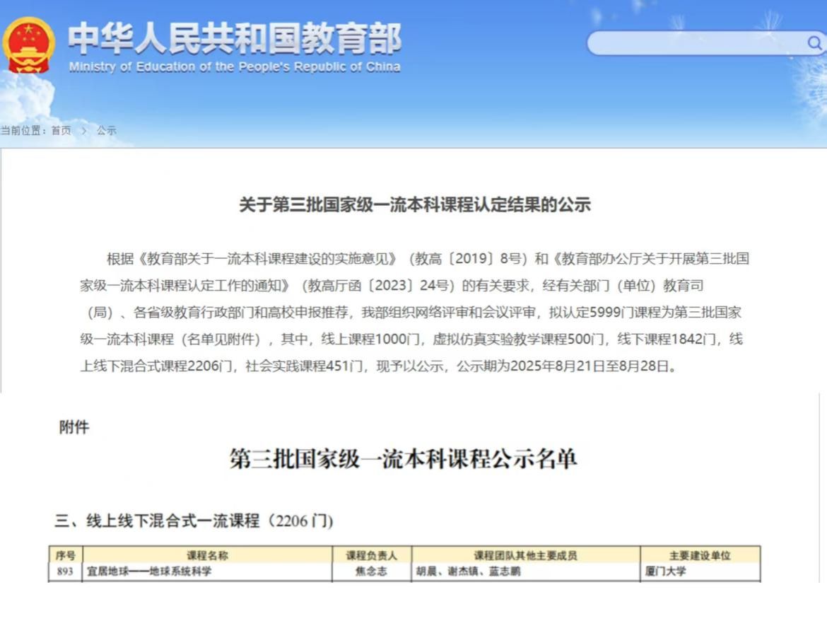 近日,教育部发布了《关于第三批国家级一流本科课程认定结果的公示》,我院焦念志院士领衔的《宜居地球——地球系统科学》课程入选线上线下混合式一流课程认定名单,这是我院在课程建设方面取得的又一标志性成果。