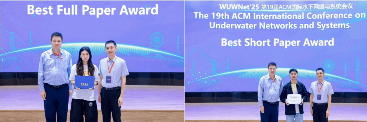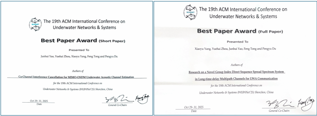 10月29至31日,第19届“ACM水下网络与系统”国际会议(ACM International Conference on Underwater Networks & Systems, WUWNet’25)在深圳举办,厦门大学海洋与地球学院博士研究生杨逍宇和姚俊辉表现卓越,分别荣获最佳长论文奖与最佳短论文奖。