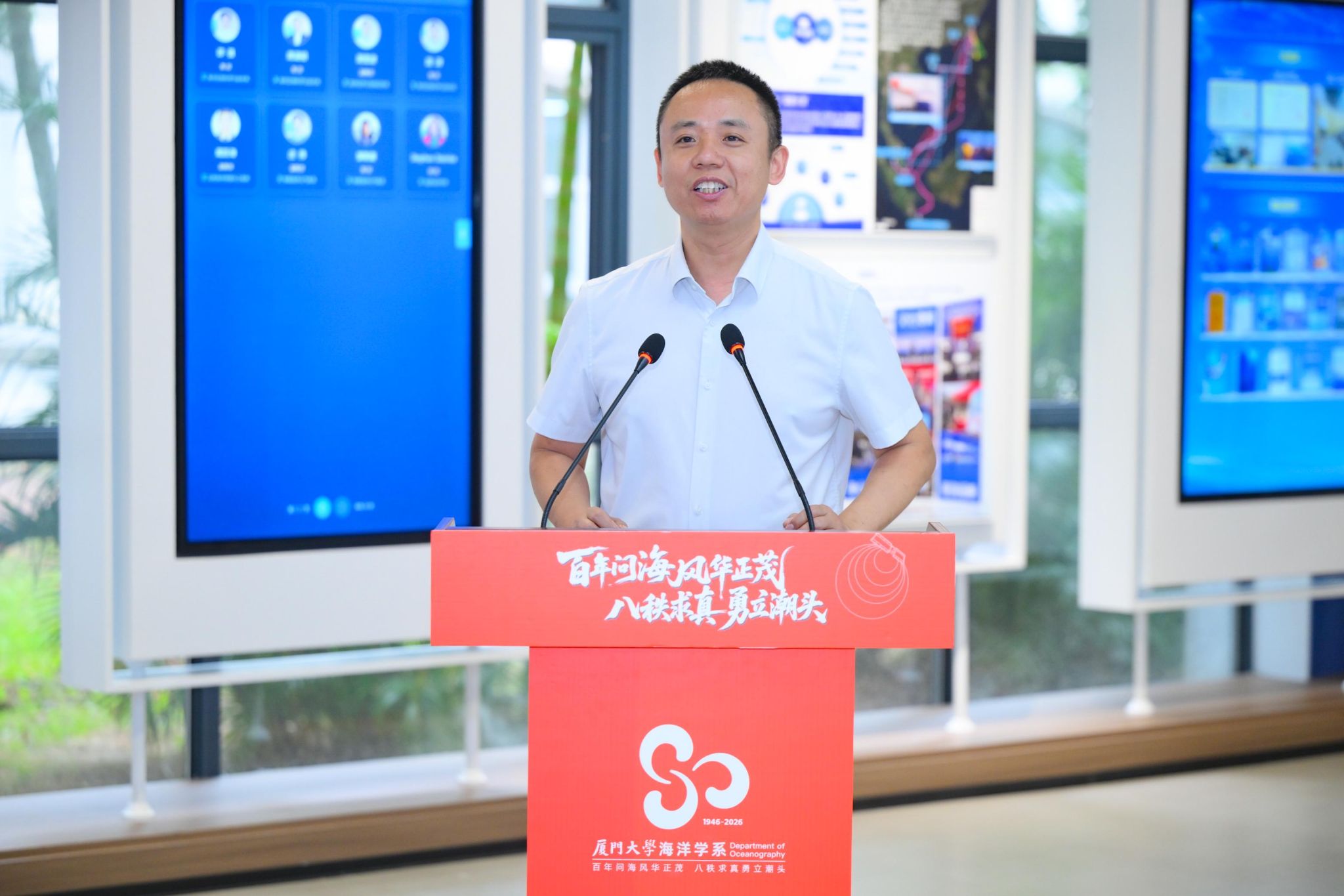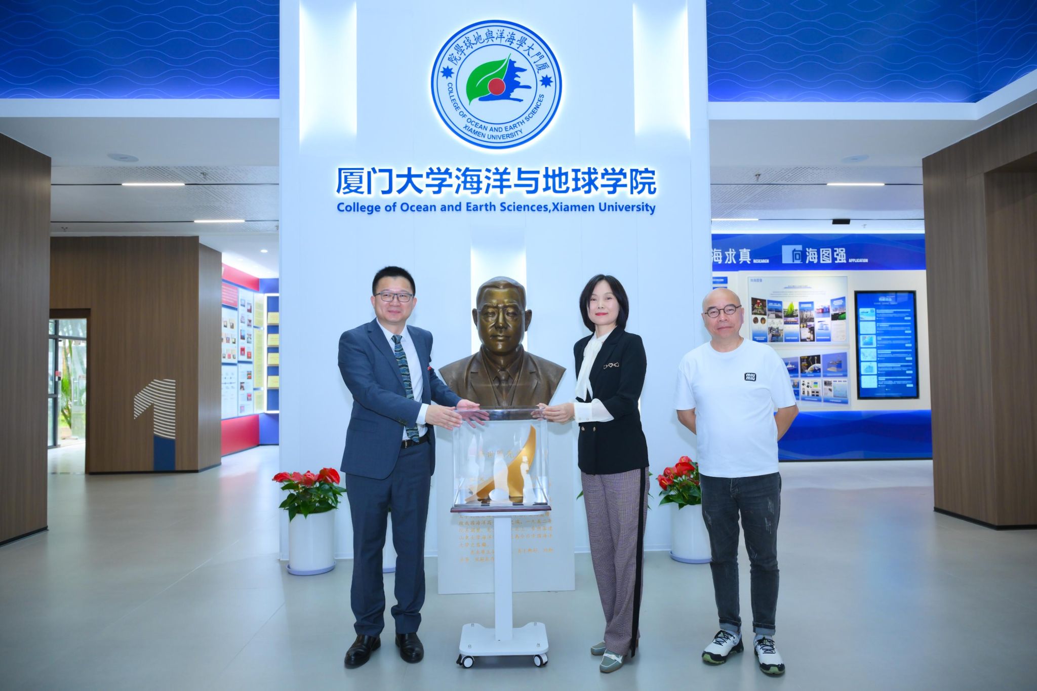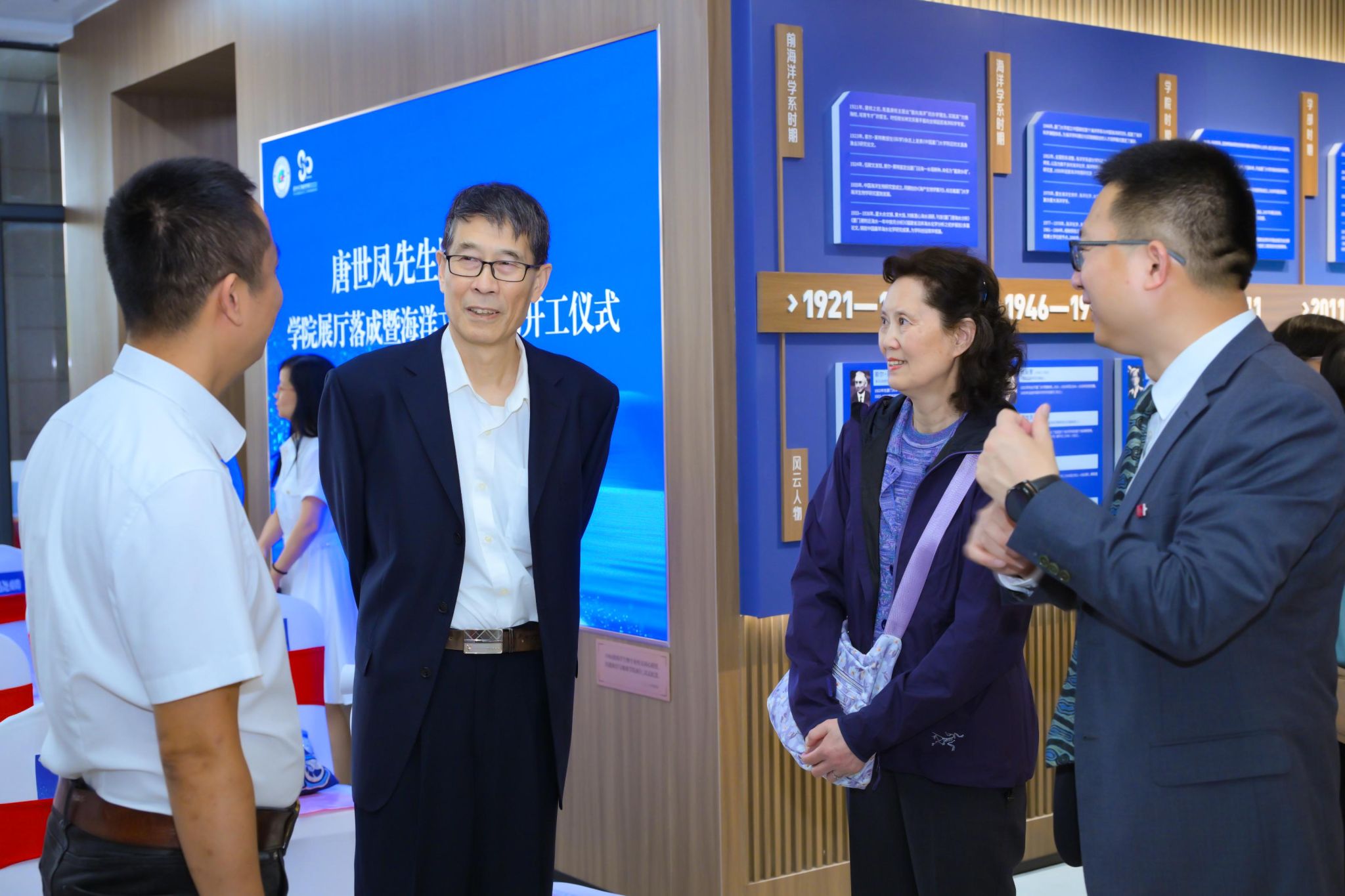 仪式最后,由 1986 级海洋生物校友共同捐资建设的学院展厅正式落成开放。学院展厅系统梳理了学科百年发展历程,集中展示人才培养、科研创新等方面的办学成就,是文化育人与对外交流的重要平台。