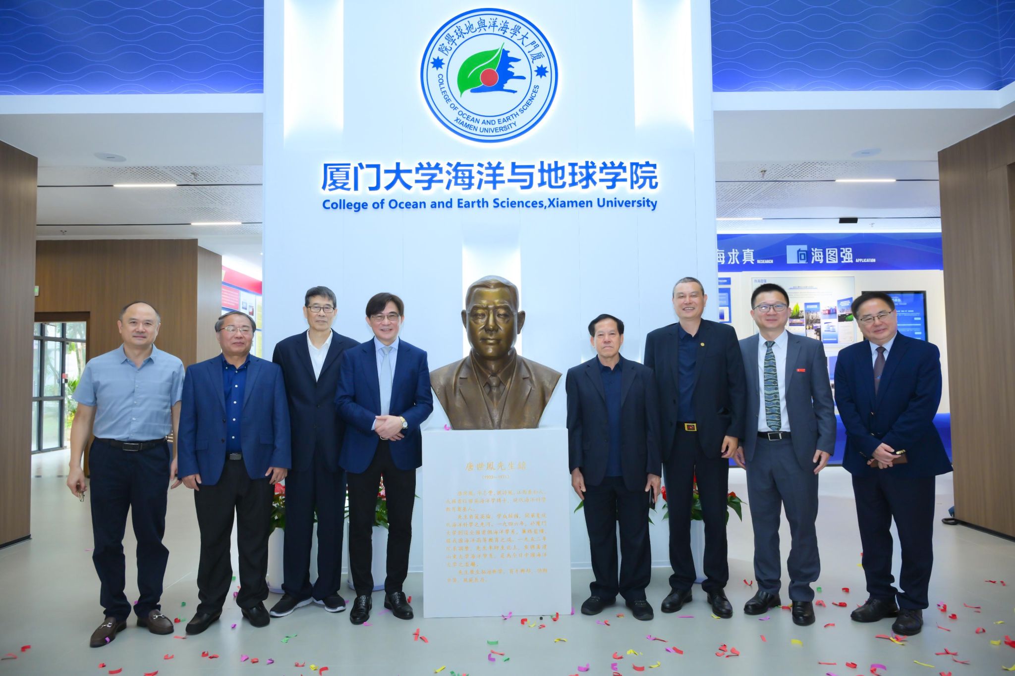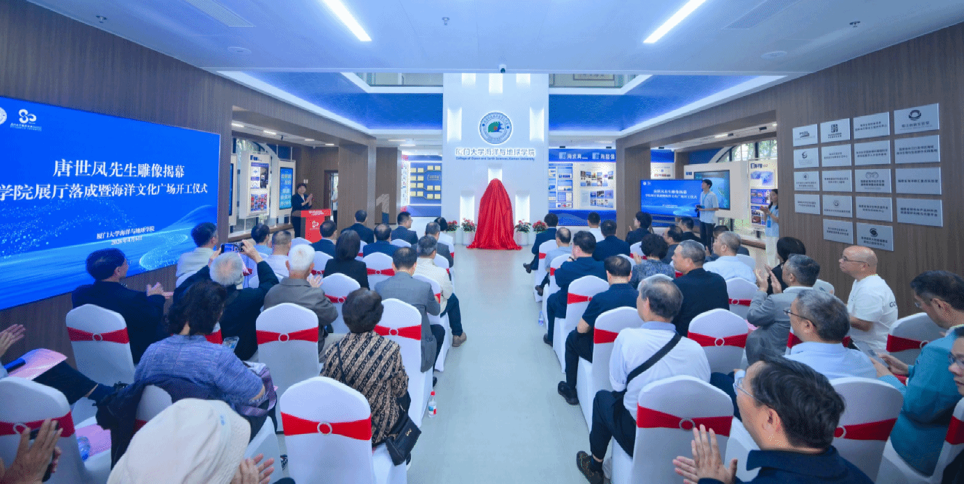 4 月 6 日上午,厦门大学海洋与地球学院在翔安校区希平楼一楼大厅,庄重举行唐世凤先生雕像揭幕、学院展厅落成暨海洋文化广场开工仪式。本次活动恰逢厦门大学海洋学科发展 105 周年、海洋学系建系 80 周年,三大文化工程同步落地,既是对学科先贤的深切缅怀,也是对百年海洋文脉的赓续传承,更凝聚着海内外校友心系母校、反哺学院的深厚情谊。中国科学院院士、厦门大学讲席教授戴民汉,福建省人大常委会原副主任、海洋与环境学院创院院长洪华生,唐世凤先生四子唐乐永,中国海洋大学海洋与大气学院院长林霄沛、海洋地球科学学院党委书记孙婧,翔安校区管委会副主任杨旸等校内外嘉宾,学院领导、师生代表以及 1986 级、1988 级等校友代表出席仪式。活动由海洋与地球学院党委书记刘艳杰主持。