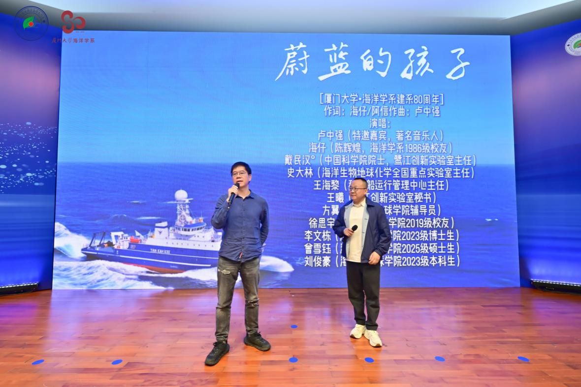 薪火赓续,弦歌回响。1986级海洋学系校友陈辉煌携手著名音乐人卢中强倾情创作系庆主题歌曲《蔚蓝的孩子》,会上进行线下首发,献礼八秩华诞。