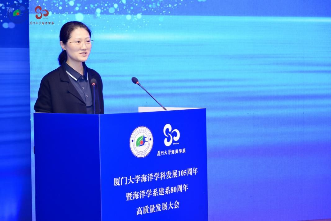 教师代表,海洋与地球学院张瑶教授回顾了自己与厦大海洋紧密相连的人生轨迹,表示将继续深耕讲台、潜心科研,把个人的理想追求融入祖国的深蓝事业中,带领学生“把论文写在祖国的万里海疆”,为强国伟业培育“蓝色”接班人。