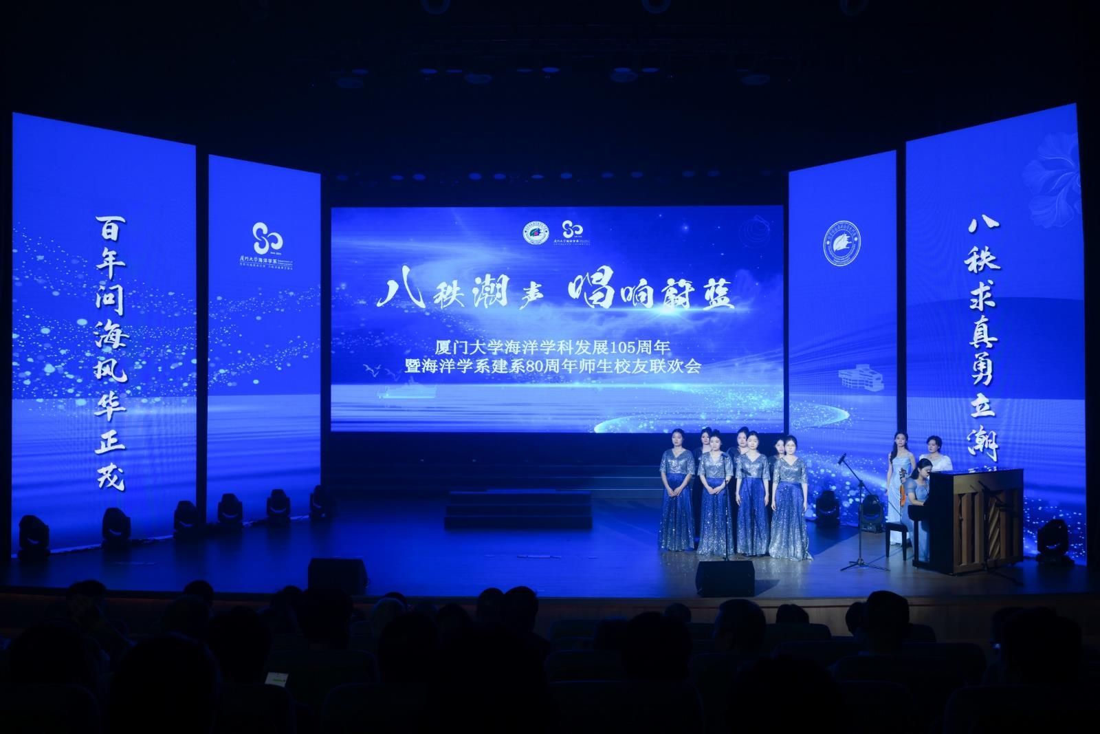 南强情深,薪火相传。校友归来、师生同台,以歌声与舞姿共贺厦门大学海洋学系八十华诞,定格最美相聚时光。1986 级校友陈辉煌携《蔚蓝的孩子》原创人员齐聚现场、深情演绎,唱出每一位厦大海洋人心底最柔软滚烫的共鸣。衣袂飞扬,身姿流转,师生舞蹈队以灵动舞姿演绎守护蔚蓝之志。校友家属陈秋灵献演越剧选段,曲调典雅、水袖轻扬,流转千年古韵;各级海洋校友献唱校园金曲,带领全场观众重返少年时代,共叙光阴的故事。灯光聚焦,模特队身着嘉庚建筑风格服装,台步轻盈,神情自信, 绘制一副动态的厦园画卷。