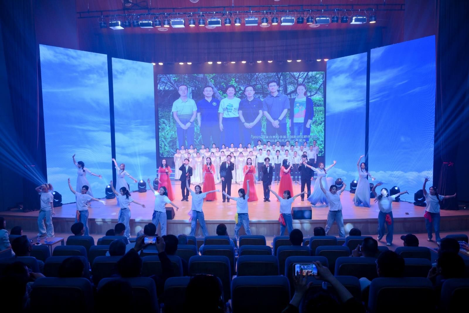 向海图强,再启新航。站在新的历史起点,厦大海洋人勇担使命,以奋斗之姿奔赴深蓝。年轻师生们将携手同行的温暖、逐浪出发的活力与对未来的憧憬,融入每一个动作,舞出了海洋人向海而生的蓬勃朝气。师生大合唱舒缓深情,歌声里藏着对海洋馈赠的感恩,对前辈筚路蓝缕的致敬,唱出几代海洋人深耕蓝色疆土的坚定,也唱出了厦大海洋人以海为志,向着海洋强国扬帆再出发的决心。联欢会在《新的天地》磅礴的旋律中圆满收官,大气恢弘的歌声与现场灯光交织,将八秩风华与海洋深情凝成永恒回响,激励全体海洋人以赤子之心再赴深蓝,在海洋强国的时代浪潮中开辟新的天地。