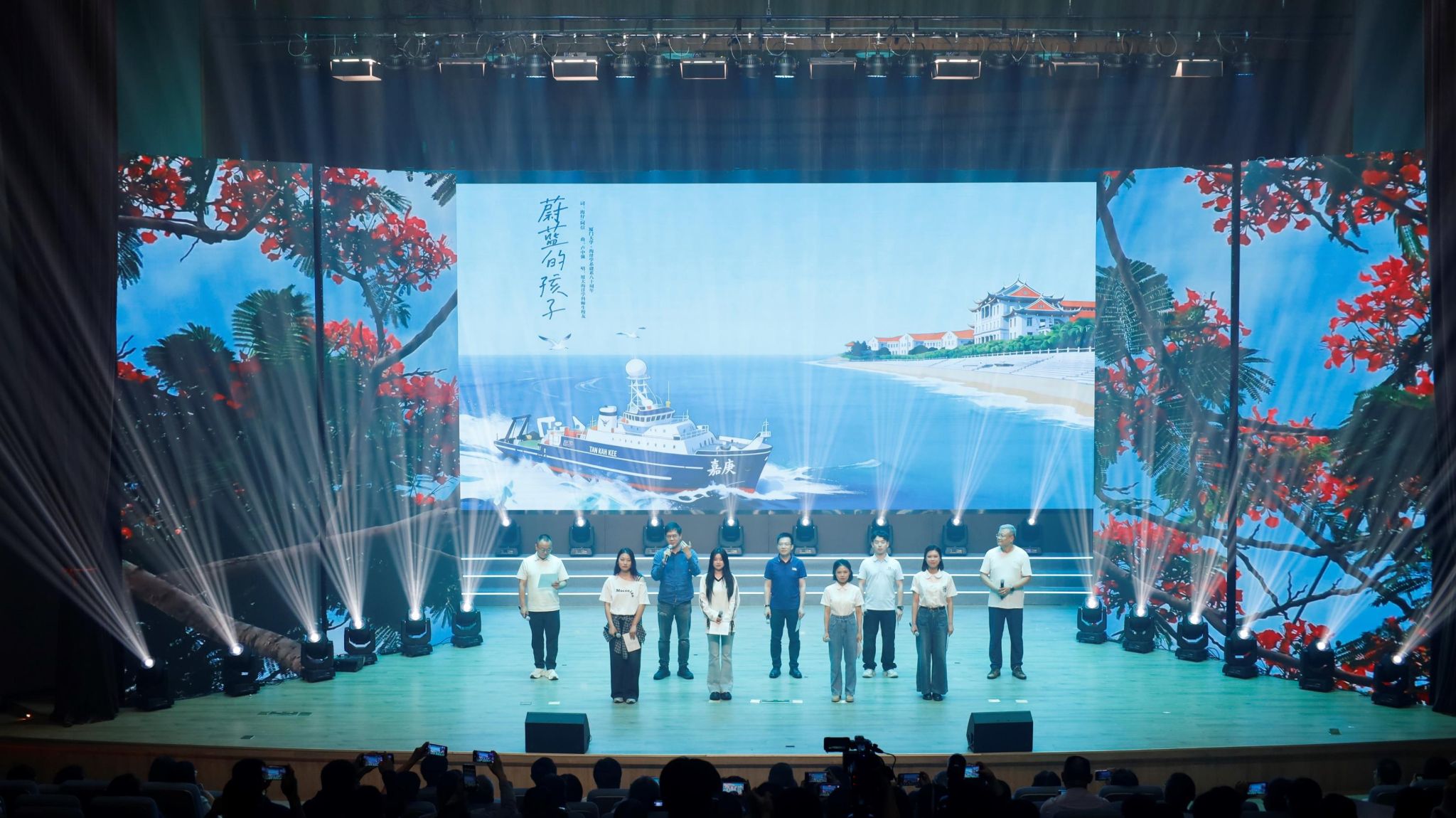 奋楫扬帆,笃行不怠。一代代厦大海洋人接续书写蔚蓝答卷,向着世界一流奋勇攀登。"嘉庚"号航次首席科学家与船管中心工作人员以一曲《海阔天空》唱出海洋人乘风破浪、探秘深蓝的无畏豪情和矢志一流、向海图强的使命担当。琴弦波动,笛音轻吟,民乐合奏娓娓道来,勾勒与海相伴的诗意。"山海之约"实践队、"嘉梦海扬"志愿服务团的学生代表们以歌为帆,将一路山海载至现场、传递温暖。"海二代"童声朗朗,父母轻声应和、言传身教,一唱一和间,是海洋人家风传承,是奔赴星辰大海的接力。