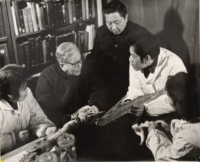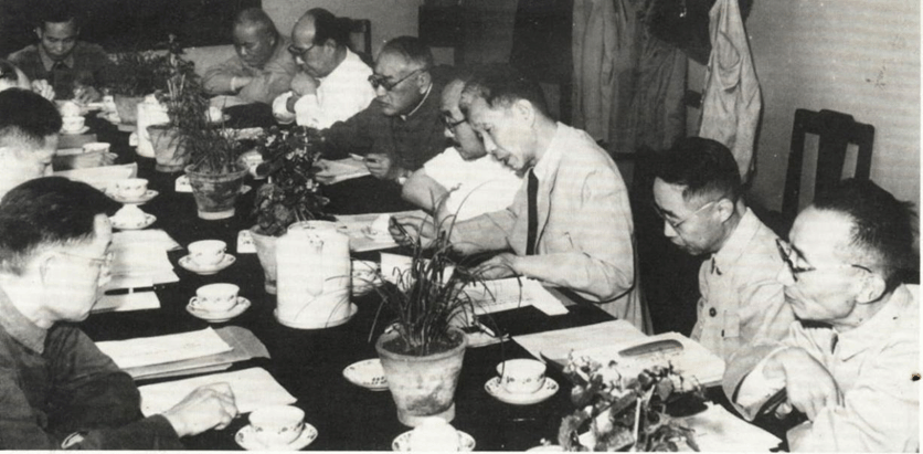 1955年中国科学院成立学部,伍献文(右三)和秉志(右六)正在讨论工作