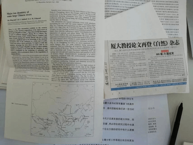 胡老在厦门大学建立并发展了河口化学这一研究领域。1982年,胡老的论文——《中国各大河流的主要离子化学》在《Nature》总刊发表。这篇论文是上世纪厦门大学学术论文的代表性成就之一,也是厦门大学学者在《Nature》发表的第一篇科学论文,是相关领域中被引用次数最多的一篇文章。“大学做学问的水平体现在你的科研论文,论文被引用的越多,说明水平越高,这个是真真实实的体现,不可能弄虚作假。”至今胡老依然珍藏着这篇论文的原稿,随着岁月的洗礼,纸张已微微泛黄,但字里行间却透露着不朽的力量,这是时间对一个优秀的海洋工作者最大的温存与致敬。