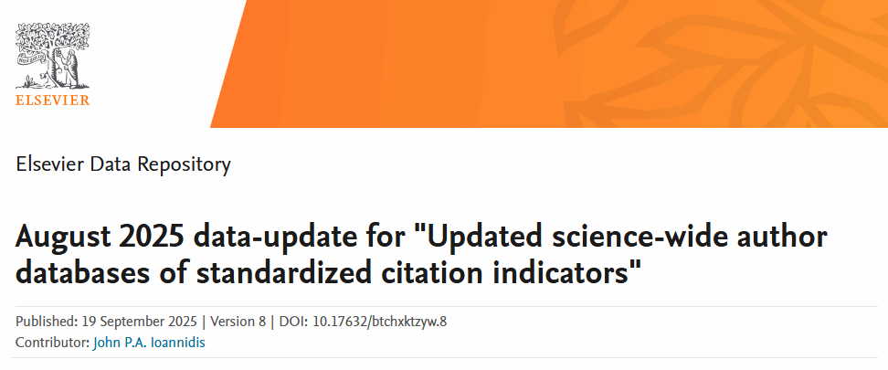 近日,斯坦福大学(Stanford University)和国际权威学术出版社爱思唯尔(Elsevier)共同发布2025年全球前2%顶尖科学家榜单(World's Top 2% Scientists)。