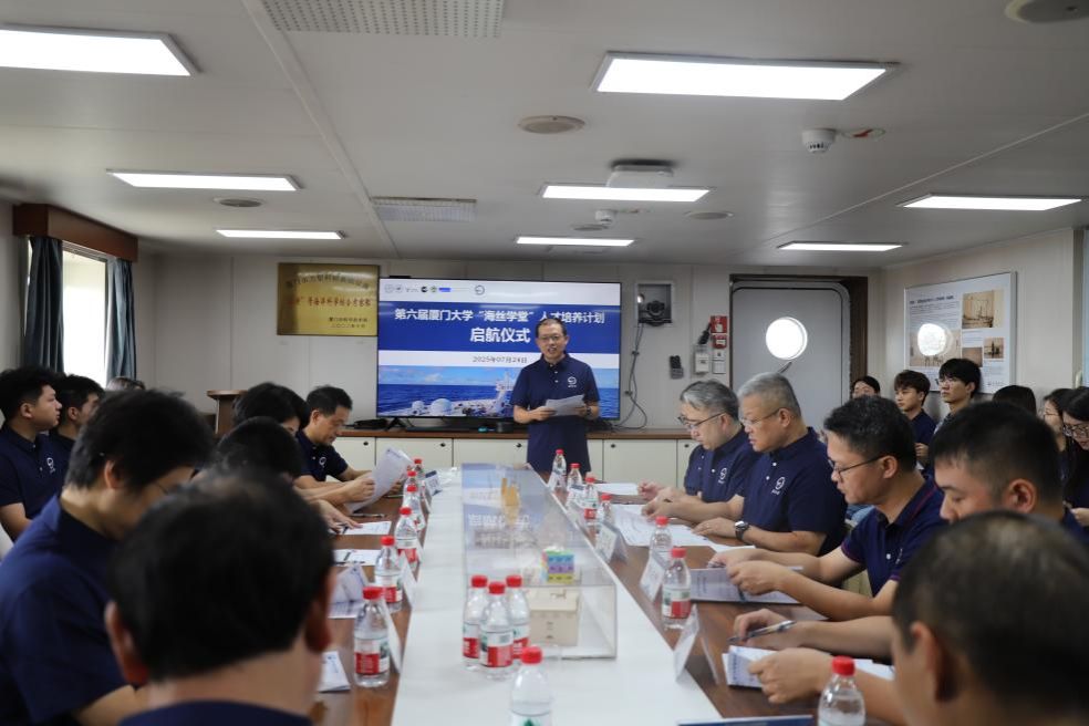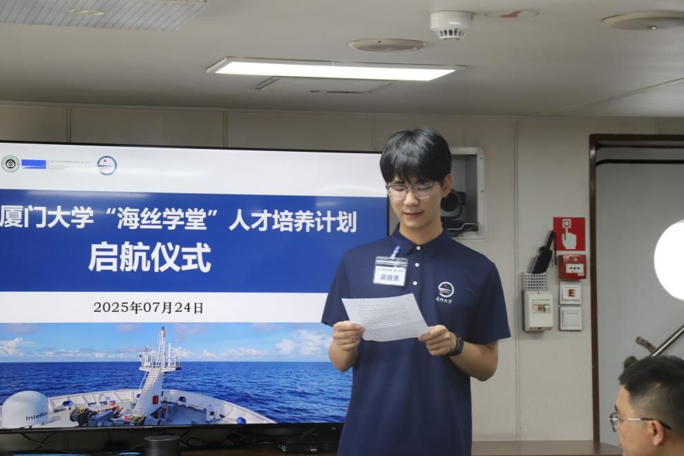 7月24日上午,厦门大学第六届“海丝学堂”人才培养计划启航仪式在“嘉庚”号科考船举行。厦门大学党委宣传部副部长郑莉,学生工作处副处长陈国全,现代教育技术与实践训练中心副主任、教务处副处长李成,国际合作与交流处副处长蔡熙乾,实验室与设备管理处副处长张昌胜,团委副书记郑音,海洋与地球学院党委副书记陈向柳、副院长李骁麟,环境与生态学院副院长马剑,科考船运行管理中心主任王海黎, “嘉庚”号科学考察船船长汤少华,科学考察船航次探测长蔡建南,以及第六届“海丝学堂”第二航段的30余名师生参加了仪式。仪式由海洋与地球学院副院长罗亚威主持。