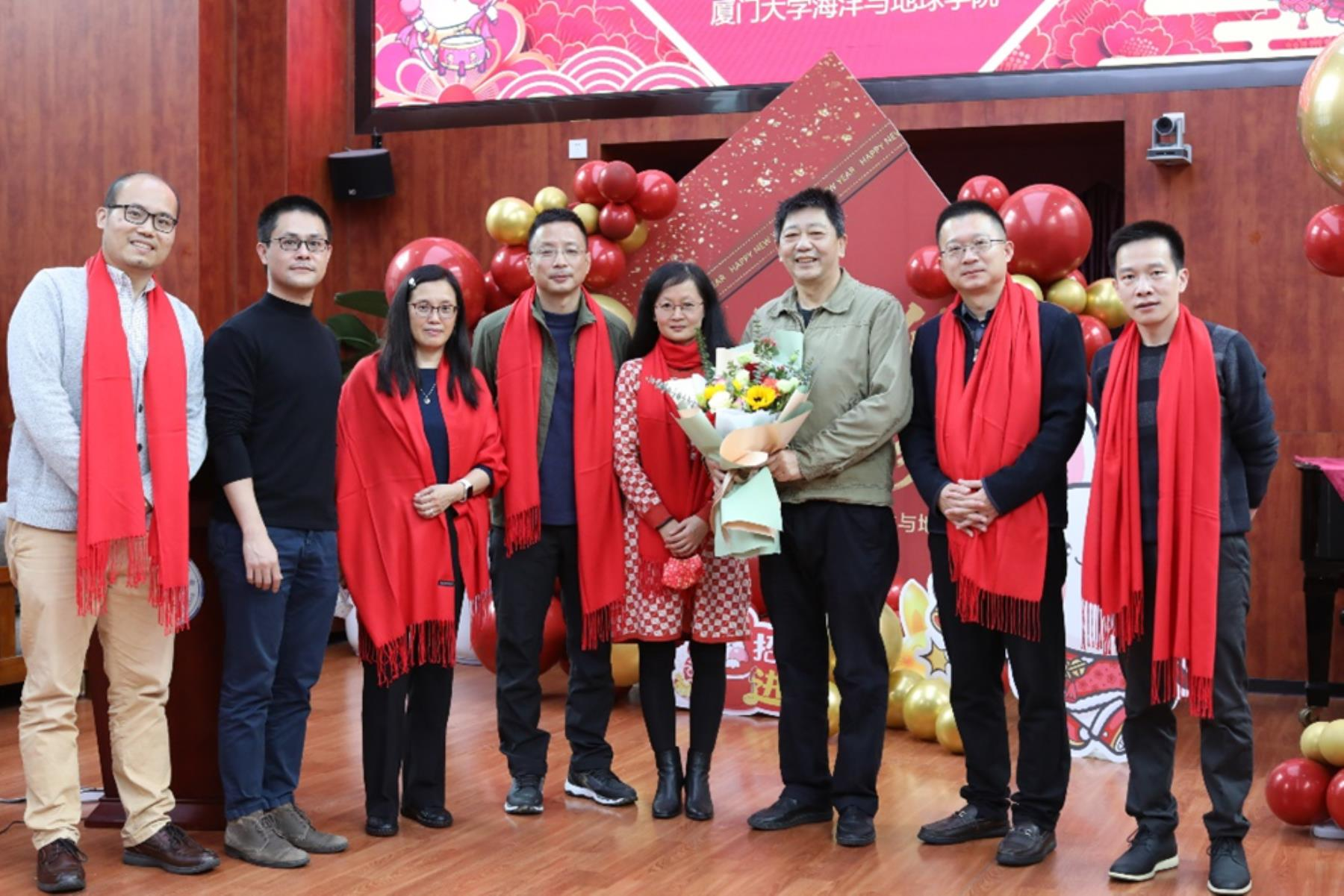 芳华成蹊,薪火相传。借本次活动,学院为2022年退休教师和新进教职工人员举行了简单而又不失仪式感的荣休及迎新仪式。学院党委吴立武书记和学院院长史大林分别为退休教师潘伟然送上了金质校徽、感谢信和“嘉庚”号科考船船模,潘老师的学生、学院新进教师白晓林为潘老师献上鲜花。潘老师深情回顾了在学校学习、工作、生活43年的美好回忆,表达了对学校、学院以及领导、同事深深的谢意和浓浓的情谊,并向与会人员致以节日祝福。