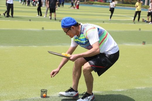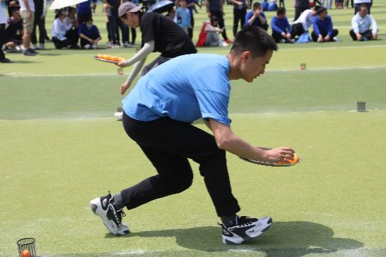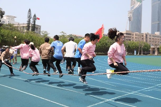 接下来是深受教职工欢迎的趣味运动会。本次运动会共设置小马过河、抢收抢种、拔河、多人跳绳四个项目。在小马过河环节,运动员通过踩入两个轮流摆放向前的游泳圈前进。他们踏着整齐而灵活的步伐,坚定地朝着终点进发。在抢收抢种环节,运动员手持装满10个乒乓球的托盘起跑,将球依次投入沿途的10个笔筒中,折返时再将球捡回托盘里,往返接力直到最后一人,大家在保证速度的同时将球精准投放,步步紧追。拔河比赛是最考验体力的环节,大家提前布置战术,在拉拉队员的口号下,同心合力、全力以赴,最终赢得比赛。最后是多人跳长绳,运动员们身轻如燕、默契十足,在长绳舞动的瞬间,不断调整姿势,保持了流畅的跳跃姿态和节奏。
