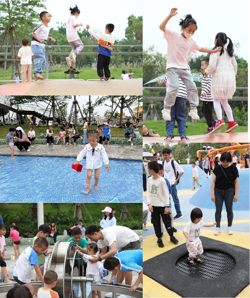 稍作休息后,进入孩子们最期待的环节——儿童公园游。园博苑内的儿童公园依景而设,周围架高的弯曲步道犹如藤蔓,中间间隔分布着紫色花朵形状的滑滑梯,分有戏水区、沙池区、秋千区、木质小楼、空中廊道和网绳攀爬等游乐区域。孩子们一下被戳中了兴奋点,跑上跑下,自由探索,和小伙伴们尽情地玩耍,家长们也纷纷加入,一起感受着童真的快乐。