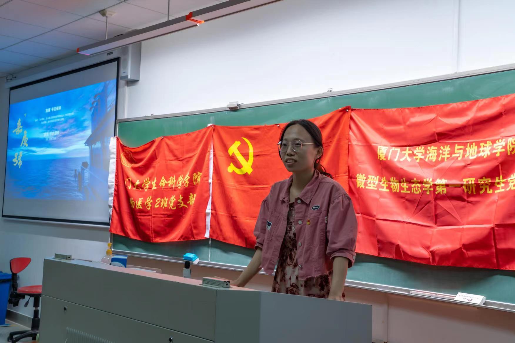 随后,微型生物生态学第二研究生党支部书记马小艺对支部成员及特色活动进行了简要介绍。支部党员徐子坤以“微碳泵引领大中和”为题进行汇报分享,带领大家深入了解“蓝碳”等生态学概念,阐述了建设海洋强国是实现中华民族伟大复兴的重要战略任务,保护海洋生态环境、实现人海和谐是海洋强国建设的内在要求。他表示,海洋负排放国际大科学计划和《宜居地球》通识课程是厦门大学建设海洋强国、研发海洋碳汇、培养海洋复合型人才的重要抓手,海洋学子要努力学习,积极开展科研,为实现碳达峰、碳中和贡献力量。
