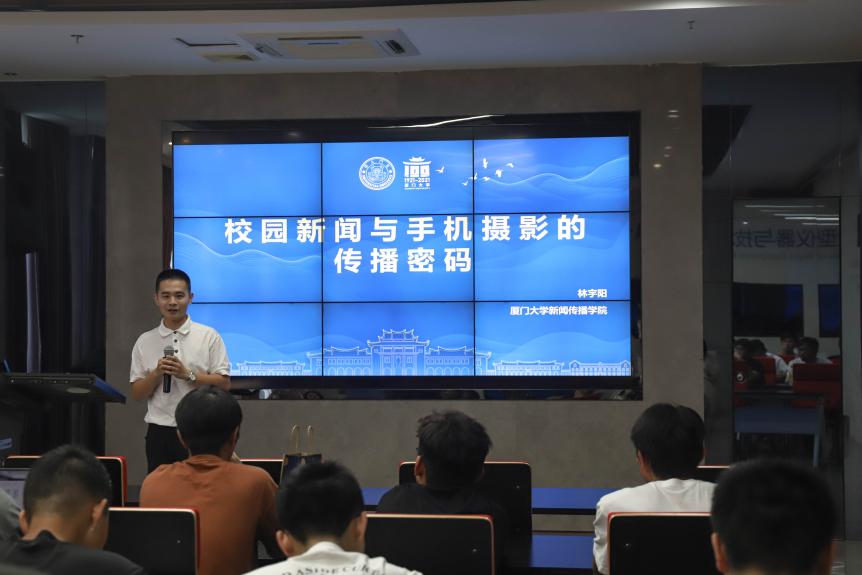 2023年5月26日中午,由厦门大学海洋与地球学院举办的“镜头下的世界”宣传教育培训系列讲座第二期在周隆泉楼一楼报告厅举行。本次讲座邀请到厦门大学新闻传播学院2021级硕士生、视觉中国签约摄影师、中国日报厦门记者站主任助理林宇阳,做“校园新闻和手机摄影的传播密码”的主题讲座,他结合生动的案例分享独特的摄影技巧,并立足听众传授了摄影宣传的内核。讲座由学院团委副书记徐惠聪主持。