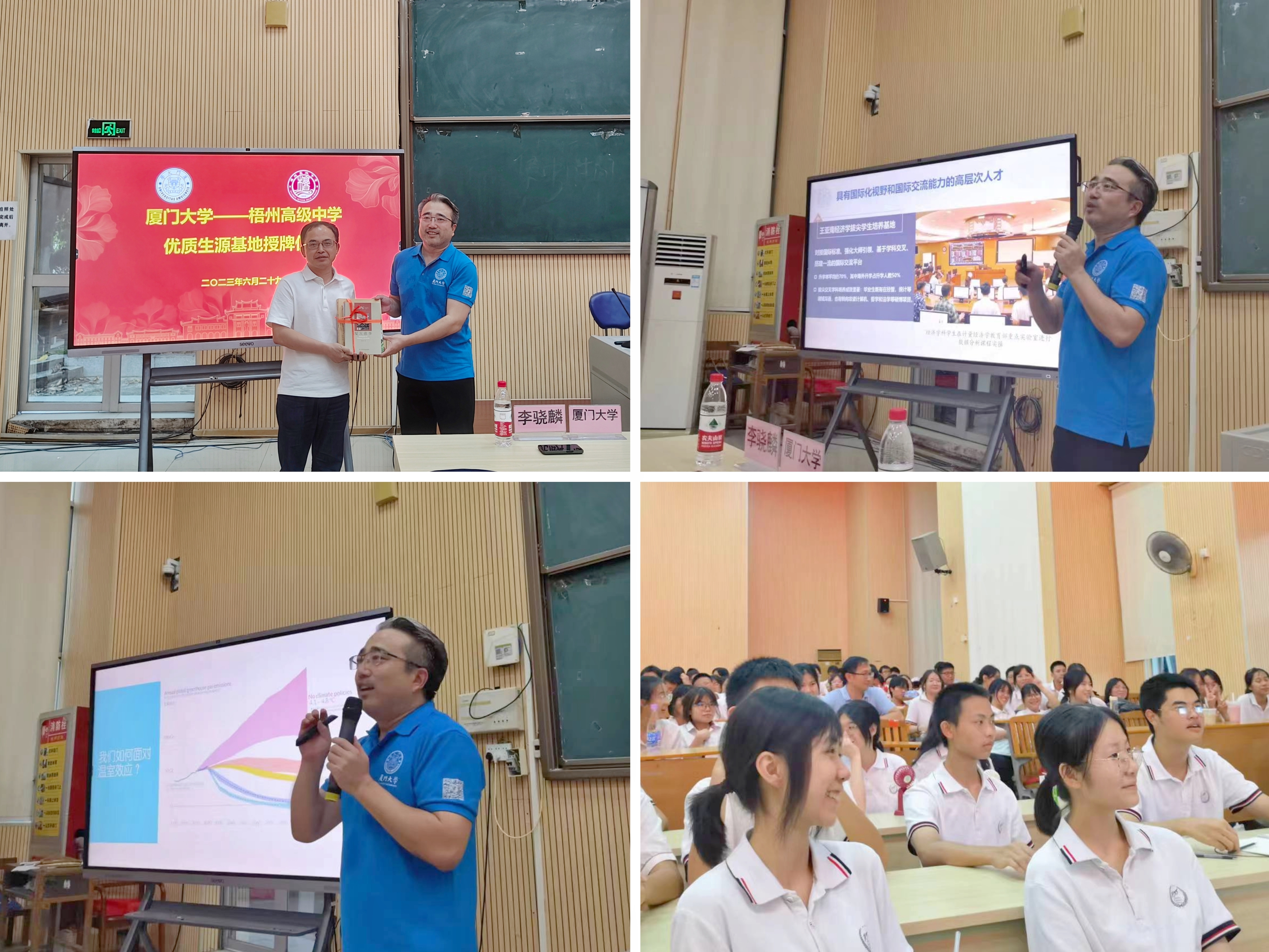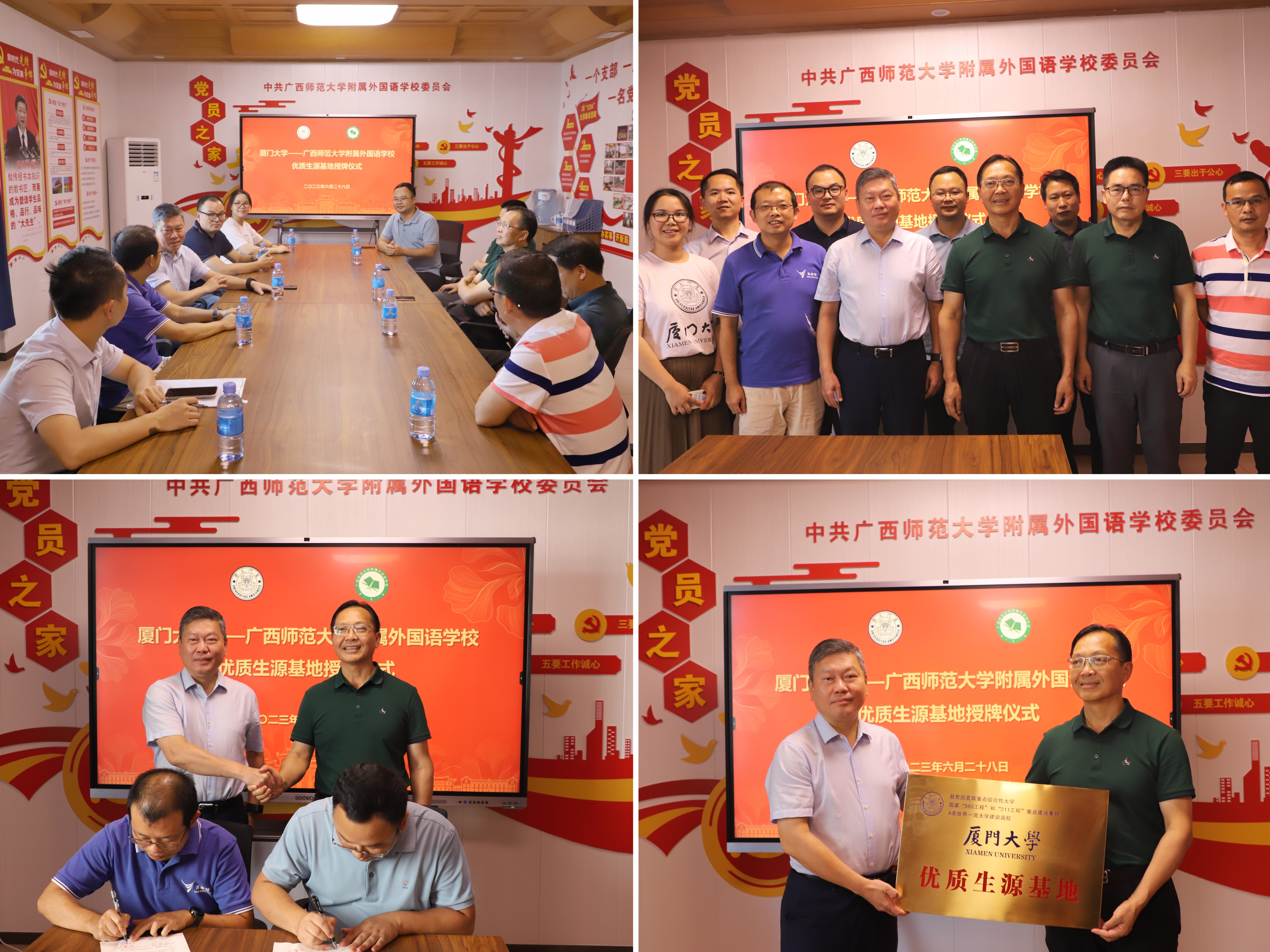 6月29日,吴立武、罗亚威、曾隆隆及校友代表赴广西师范大学附属外国语学校开展优质生源基地挂牌。广西师范大学附属外国语学校校长文国韬、教务处副主任何周、德育副主任张华及教师代表罗怀华、吴德永等出席授牌仪式。随后,双方开展了座谈交流。吴立武介绍了厦门大学的校史校情、人才培养特色,以及厦大海洋学科的优势特色,文国韬介绍了学校的基本情况,双方还深入探讨了今后的招生合作。授牌仪式后,招生组举办了专场宣讲会,罗亚威从厦门大学和海洋学科的学科体系、人才培养和科研成果等方面做了详细介绍,吴立武和校友共同解答了同学和家长们的报考咨询。
