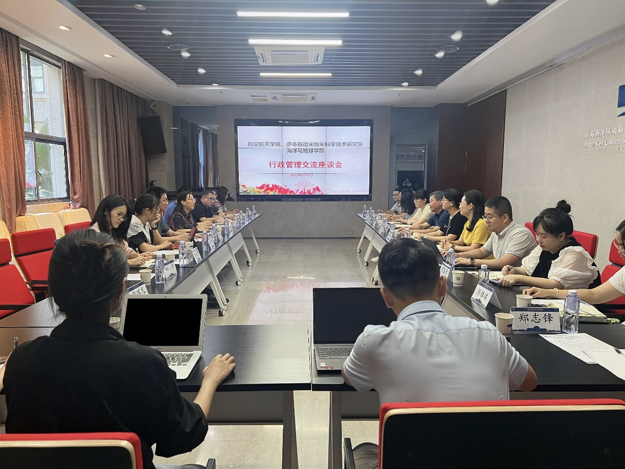 为推动学习贯彻习近平新时代中国特色社会主义思想主题教育调研成果转化,为学院、研究院高质量发展提供高效优质的支撑保障,7月7日上午,航空航天学院党委书记廖志丹率航空航天学院、萨本栋微米纳米科学技术研究院行政支撑团队代表赴海洋与地球学院开展行政管理工作经验交流。交流会在周隆泉楼一楼多功能厅举行,学院党委书记吴立武、党委副书记唐腾凤及行政支撑团队代表出席会议。