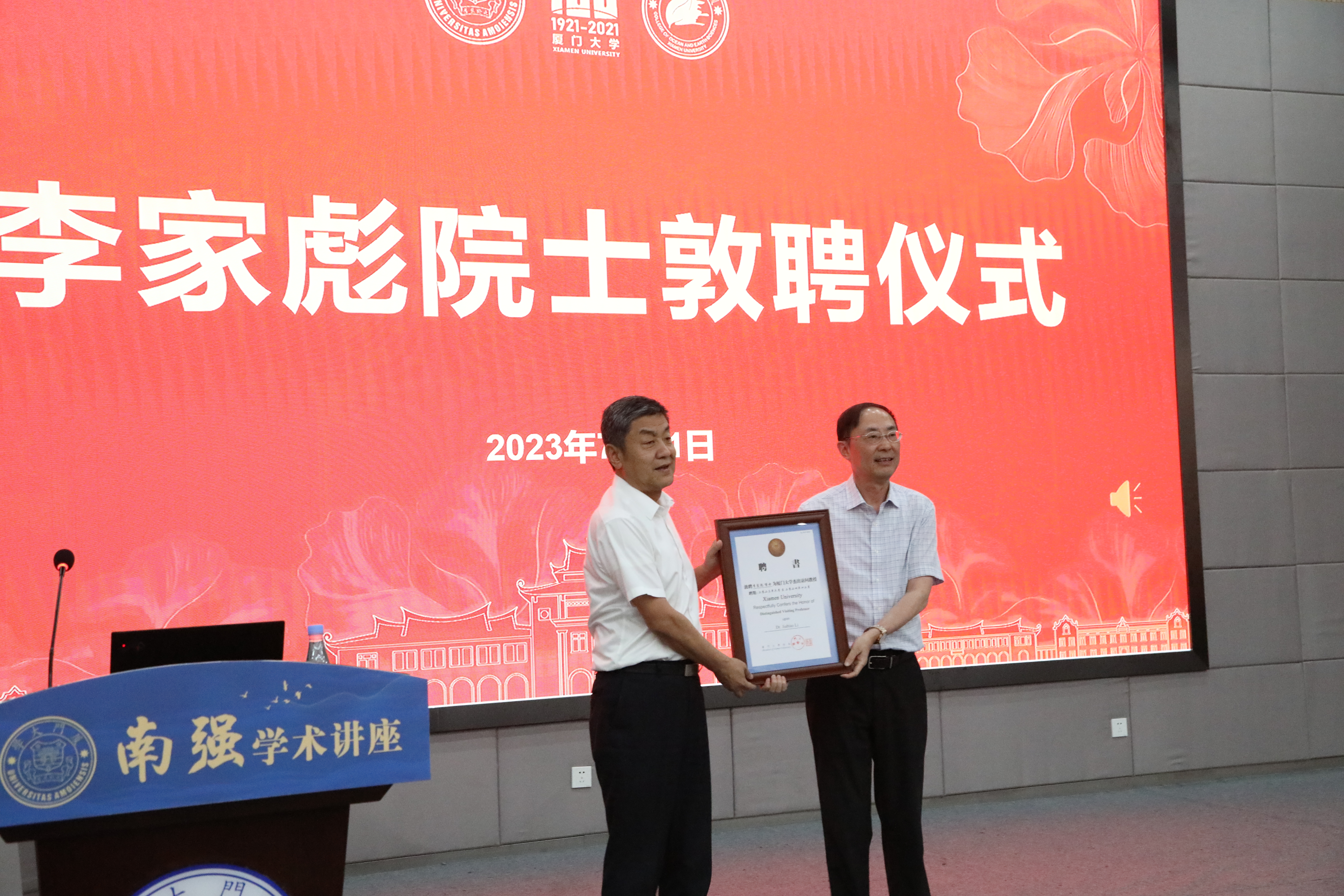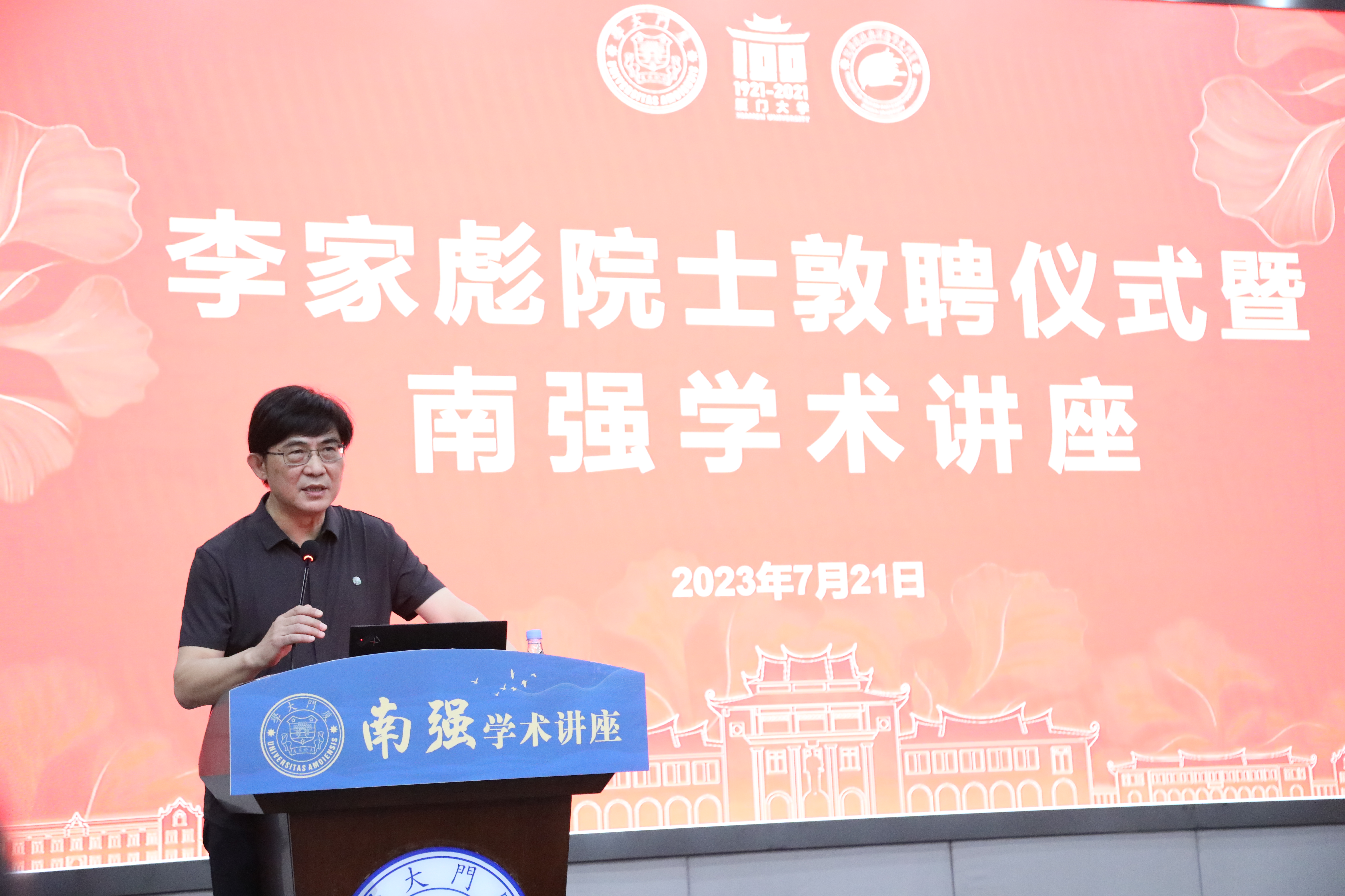 7月21日下午,我校敦聘中国工程院院士李家彪研究员为厦门大学杰出访问教授仪式暨南强学术讲座第1193讲在翔安校区德旺图书馆二号报告厅举行。厦门大学党委副书记、纪委书记全海,中国科学院院士、地球科学与技术学部主任戴民汉,新加坡工程院院士、萨本栋微米纳米科学技术研究院院长洪明辉,海洋与地球学院书记吴立武、院长史大林,人事处干部保健办公室主任蔡莉莉及师生代表等130余人出席本次活动。史大林主持仪式。