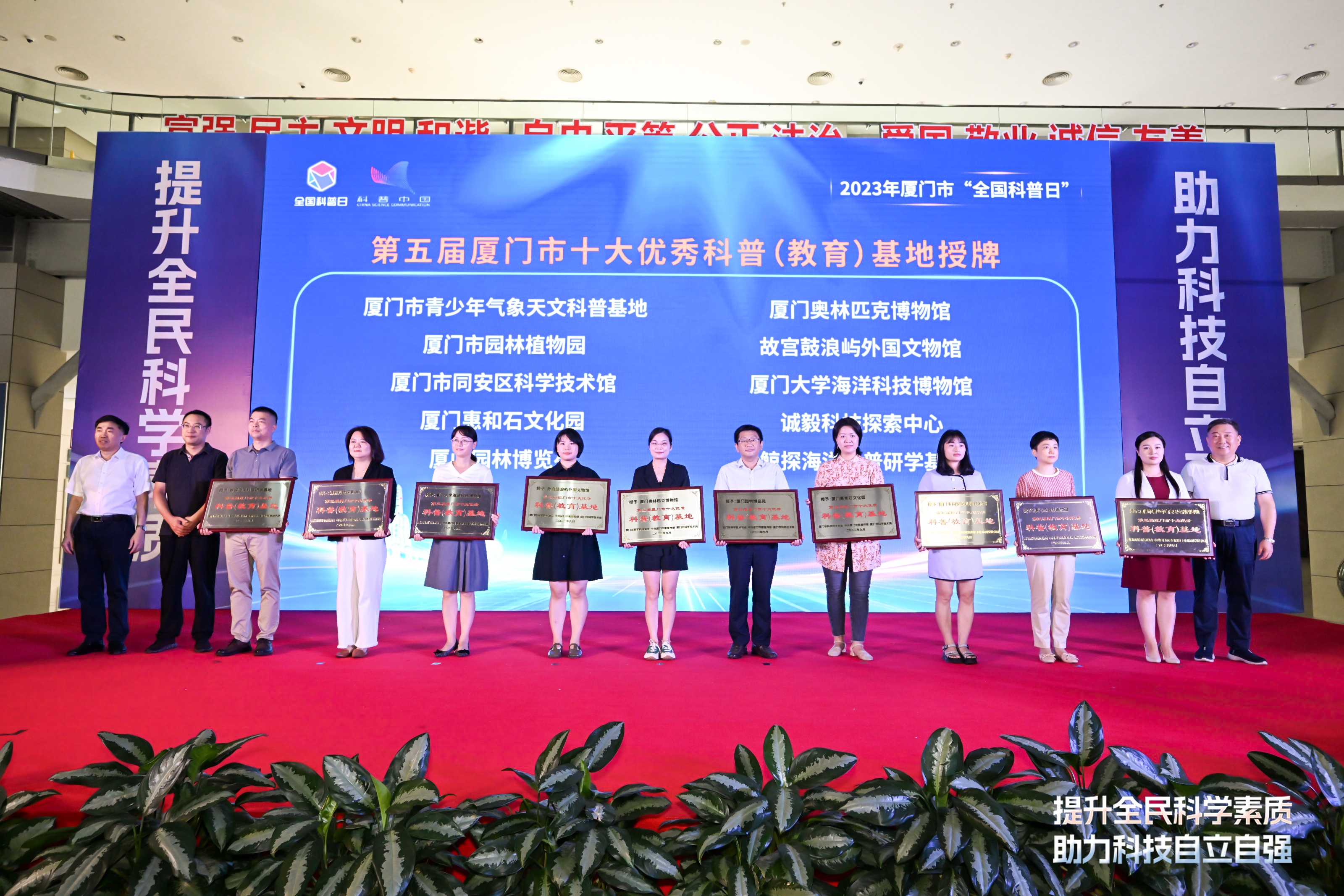 9月17日上午,以“提升全民科学素质,助力科技自立自强”为主题的2023年厦门市“全国科普日”启动仪式在厦门市美术馆举行。活动现场,厦门大学海洋科技博物馆作为全市仅有的六家“2021-2025年第一批全国科普教育基地”之一获授牌,同时从全市80家市级科普(教育)基地中脱颖而出入选第五届厦门市“十大优秀科普(教育)基地”。我院党委副书记唐腾凤代表基地出席授牌仪式。