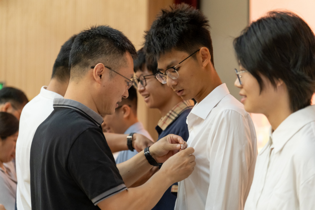 随后,与会领导老师一同为新生代表佩戴厦门大学校徽。现场全体新生整装肃立,郑重地把校徽佩戴在左胸前。小小的徽承载着厦大百年学府的使命和荣光,同时寄寓着学院对新生们的美好希冀。