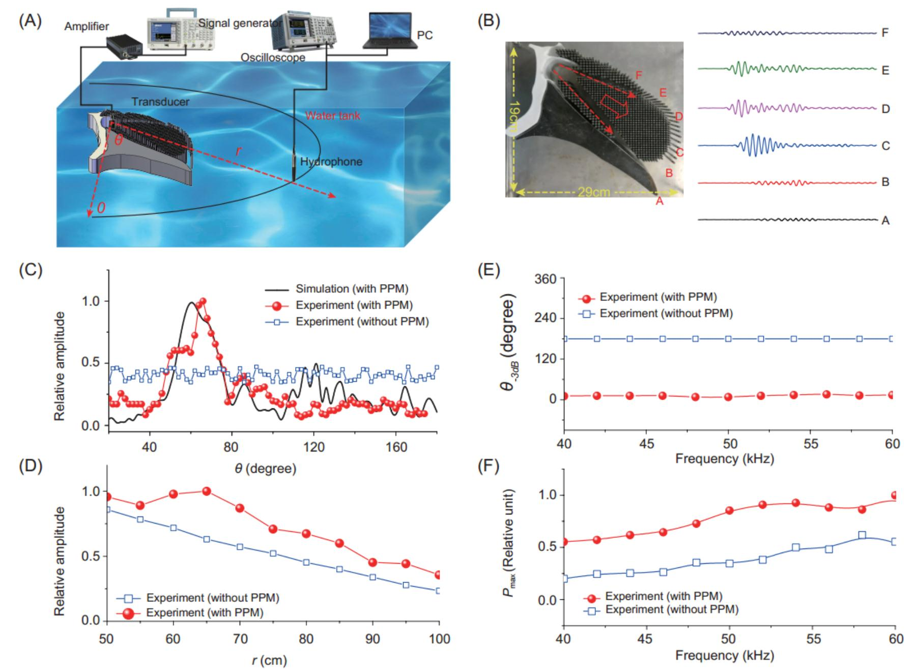 此外,该声学人工结构在抑制假目标干扰方面显示出了良好的效果,有助于提高声探测的信噪比,并区分静态目标和动态干扰物。该研究表明声学人工材料为重构江豚复杂的声学系统提供重要技术手段,在水声传感、无损检测和医学超声等领域有广泛的应用前景。此项研究成果积极扩大了厦门大学在生物声学与仿生研究的国内外影响力。