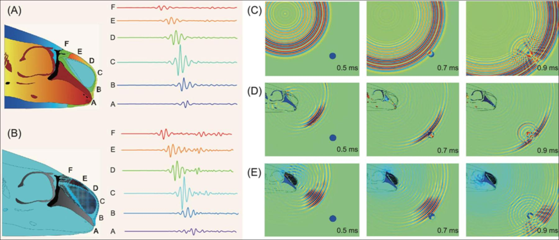 张宇教授和他的博士研究生董尔谦、美国麻省理工学院(MIT)方绚莱教授等近期在这方面取得突破性进展,提出用人工复合超材料来重构江豚声学结构。该人工结构通过气囊、头骨和变声速额隆等多相复杂介质来调控声波束(其中涉及气囊的声散射与反射、头骨-软组织的声固耦合与模式转化、声梯度组织材料的相位控制等),可以利用声波作用,在目标上产生镜像回波与弹性回波,从而实现了与江豚声呐极其相似的指向性瞬态声发射和目标探测功能。