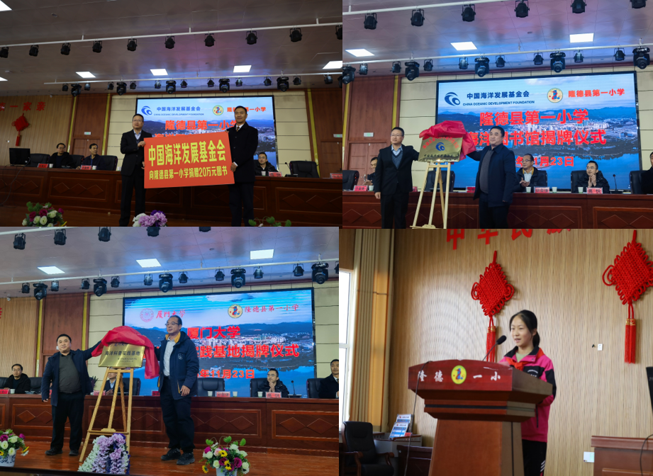 紧接着,刘福龙代表海洋基金会向隆德县第一小学捐赠价值20万元的海洋图书,隆德一小校长张旭东代表学校接受捐赠。在热烈的掌声中,海洋图书馆和海洋科普基地分别在刘福龙、邱荣锋与陈国渊的共同揭牌下正式落成。最后,隆德一小学生代表张珂做感恩发言。她代表全体同学感谢中国海洋基金会和厦门大学,表示会努力学习科学文化知识,成为海洋知识的传播者、海洋环境的保护者、祖国海洋事业的建设者。
