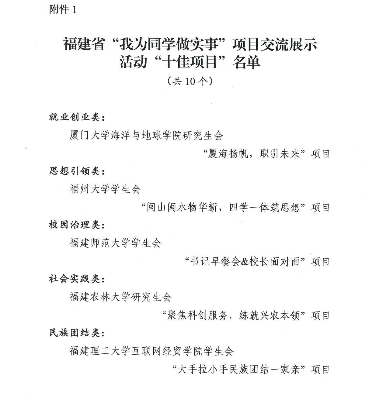 近日,福建省开展以“学思想·做实事·树新风”为主题的“我为同学做实事”项目交流展示活动,吸引全省高校学生组织广泛参与。经过初审、复评等环节,我院研究生会推出的“厦海扬帆,职引未来”就业创业类项目从54所高校学生会组织的106个项目中脱颖而出,入围线下展演活动。