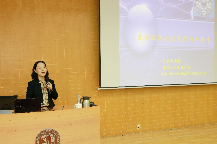 管理学院教授吴文华引经据典,深入浅出地阐述了高效团队建设和执行力提升的思路与方法。她从具体案例入手,深入分析打造高效团队的关键因素;通过群体与团队的比较,强调团队目标共识和团队成员角色认同的重要性;用环环相扣的问题引导学员们多角度地思考团队建设的重要意义和执行力提升的有效途径,将团队理念深深种在每个学员心中。