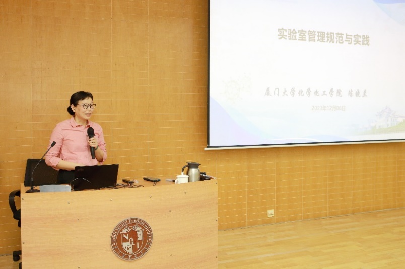 学校实验室与设备管理处副处长、翔安校区实验办主任郭志福从安全生产法律法规入手,引用实际案例,强调了高校实验室安全管理尤其是设备和危险品管理的重要性,同时结合我院实验室特点,分析了安全管理的重点难点和实验操作中的安全隐患,让学员们对实验室安全管理有了更加深刻、更加全面的认识。