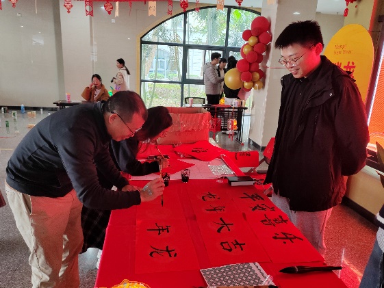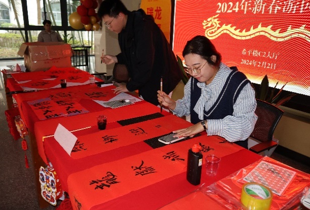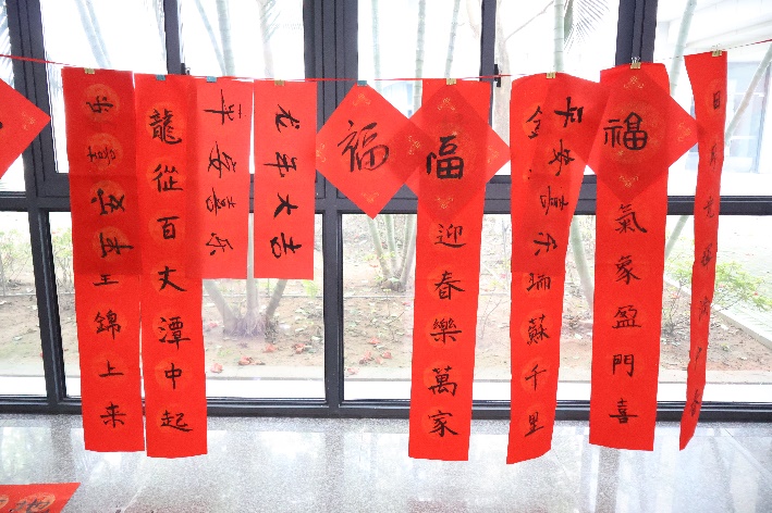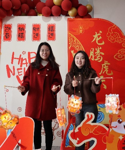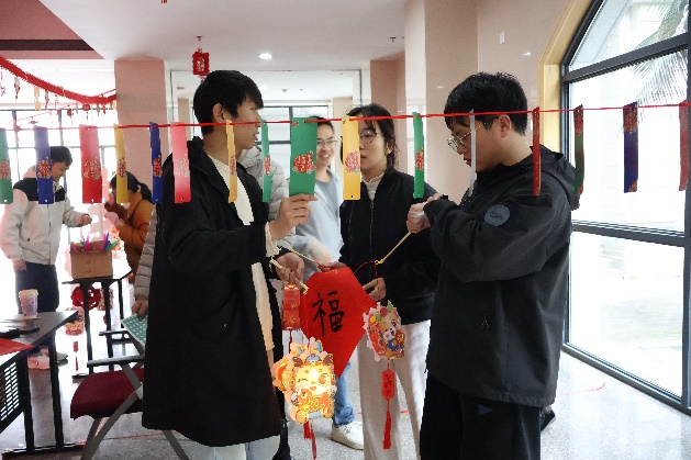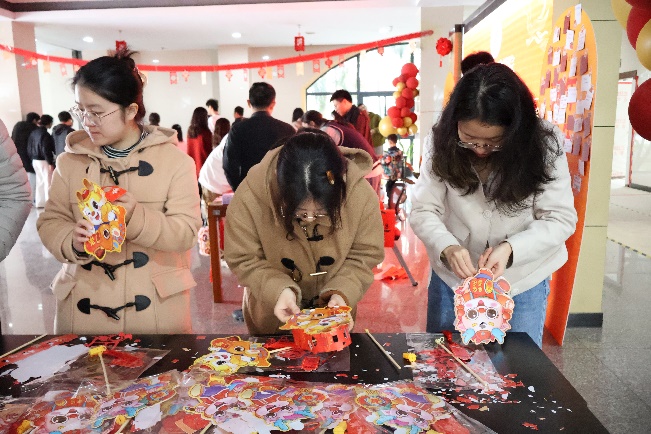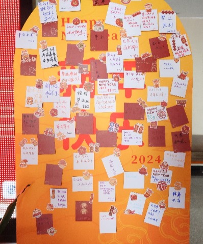 希平楼一楼大厅还特设有加入了龙年元素的打卡墙,吸引了众多同学前来合照留念,大家纷纷拿起亲手制成的花灯、剪纸, 留下崭新的龙年新影像。“文章多多,头发多多”“顺利毕业!”“愿2024年海地院越来越好!祝大家学业有成!”新春贺卡墙上,大家写下了心中对来年最真诚的祝愿。