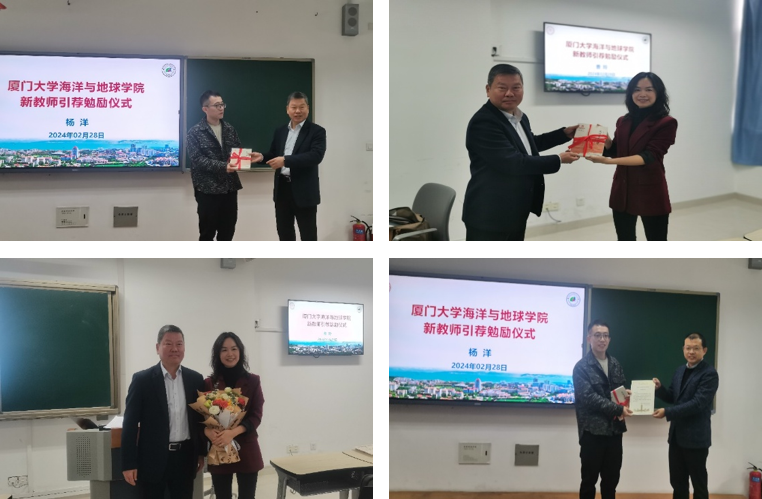 罗亚威向两位老师颁发新学期授课聘任书,对他们在厦大海洋的首次授课表示最诚挚的祝愿,同时希望海洋学子传承厦门大学“四种精神”,践行海洋强国的蓝色信念,勇担时代复兴使命。学生代表为老师献上鲜花,表达对老师的感恩之情。