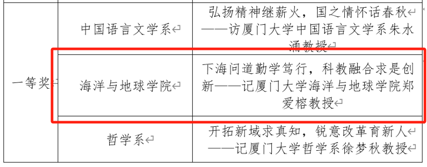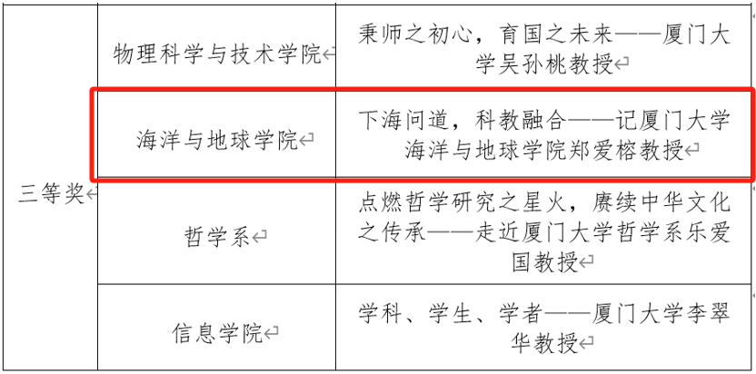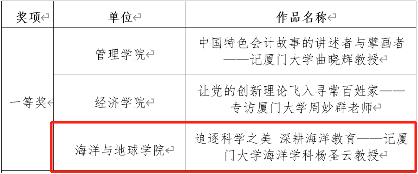 近日,厦门大学2023年“读懂中国”活动获奖名单揭晓。我院征文《下海问道勤学笃行,科教融合求是创新——记厦门大学海洋与地球学院郑爱榕教授》获得一等奖;微视频《妙追逐科学之美 深耕海洋教育——记厦门大学海洋学科杨圣云教授》获得一等奖,《下海问道,科教融合——记厦门大学海洋与地球学院郑爱榕教授》获三等奖。学院获评优秀组织奖。