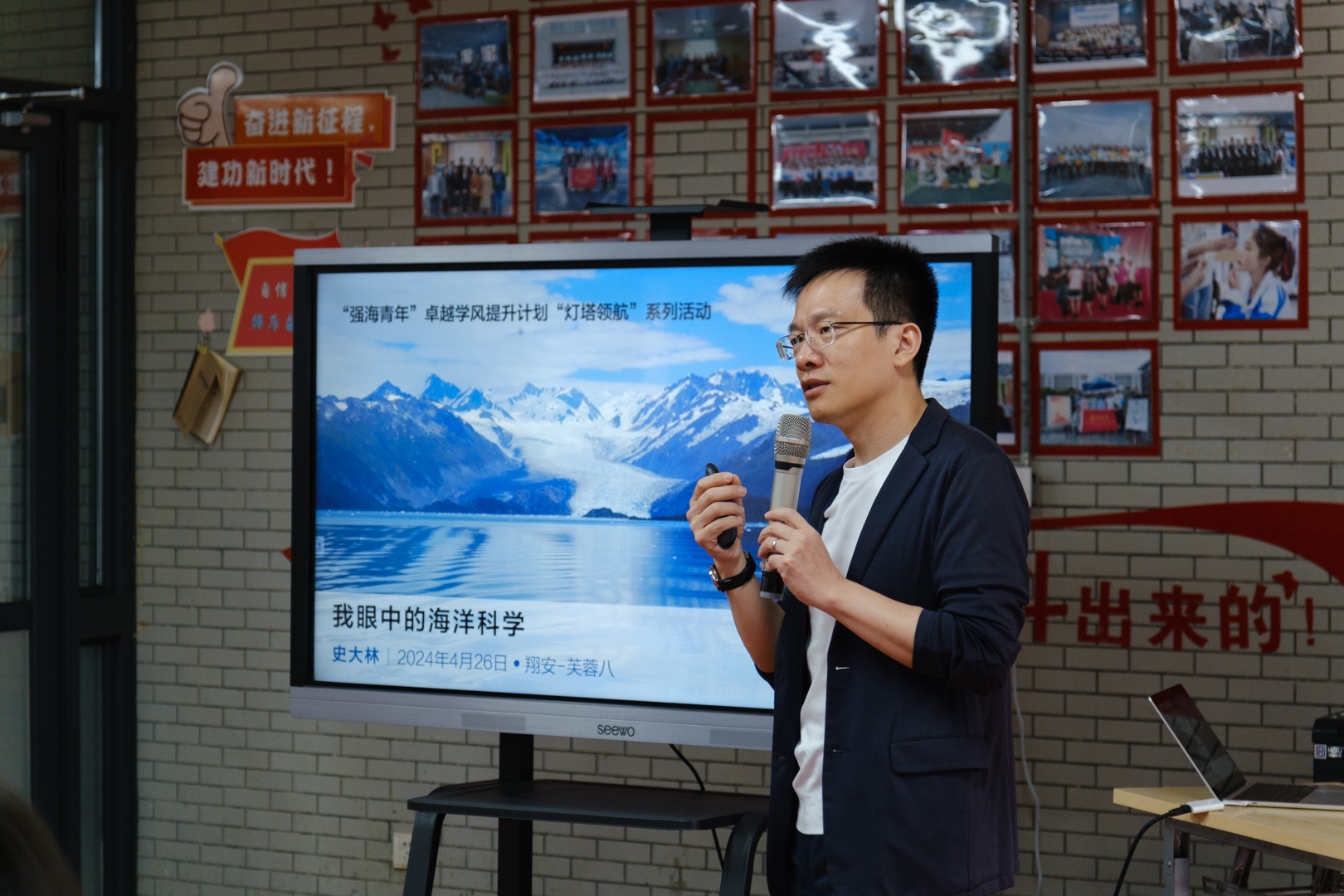 史大林为“强海青年”卓越学风提升计划讲授第一课——《我眼中的海洋科学》。他结合自身求学经历,讲述了对科研方向选择的思考与实践。他以自己在阿拉斯加湾开展航次现场实验,却因疏忽关键步骤必须重新论证实验结果,从而延迟两年在《科学》发表论文的故事,向同学们强调了把握细节对科研创新的重要影响。他还分享了“5C”学习科研方法论(Continuation持之以恒、Courage勇气、Constantly self-improvement不懈地精益求精、Collaborate交叉合作以及Challenge健康的态度挑战权威)。提到研究方向的确定,他认为“兴趣固然是最好的老师,但时间的沉淀或许会给予更牢靠的答案”。他表示“做学问不可缺少的是精益求精、止于至善的精神,以及面临困难和挑战时的坚定和勇气。当然,通力合作也是作为一门复杂开放的海洋科学研究必不可少的一环”。他希望同学们在学习中拥有健康积极的科研态度,培养合理质疑权威的勇气,自觉将个人学术研究的“小我”与国家发展的“大我”相结合,为海洋强国建设作出新时代青年的应有贡献。